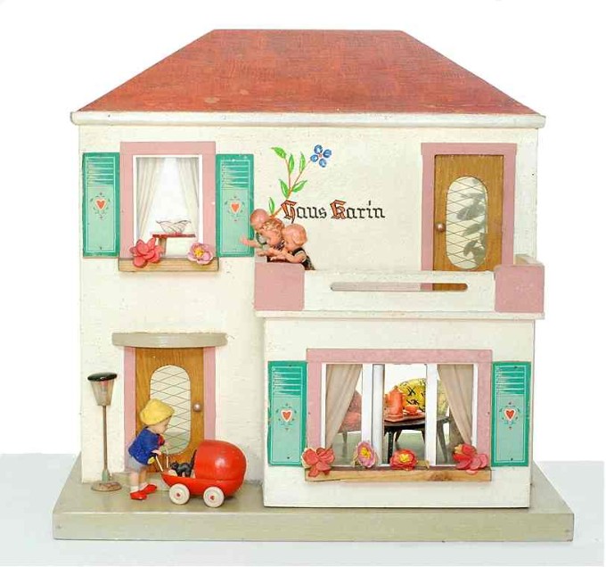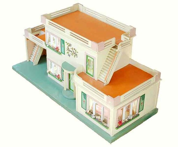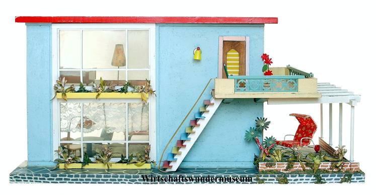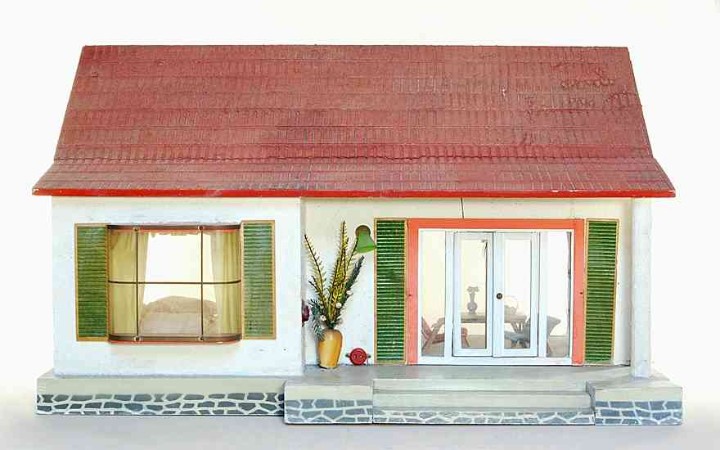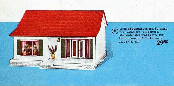 Aus einem Spielzeugkatalog um 1958: "Großes Puppenhaus mit Terrasse, zwei Zimmern, Flügeltüre, Blumenfenster und Lampe für Batterieanschluß. Sockelmaße ca. 69 x 43cm." Preis DM 29,50