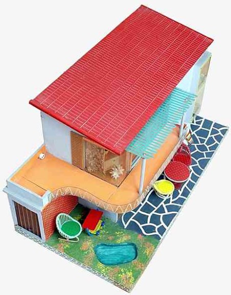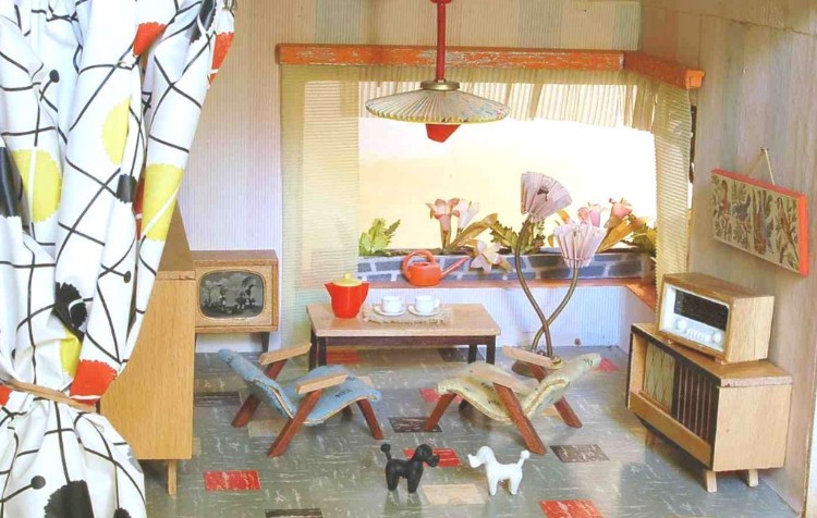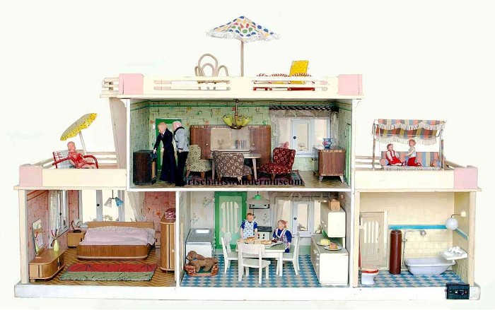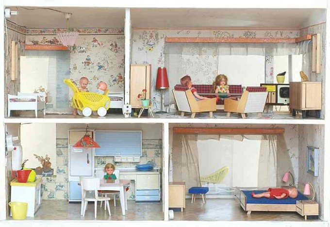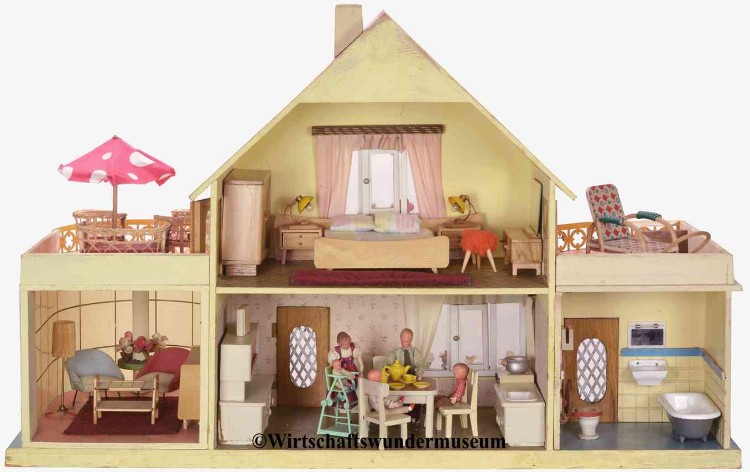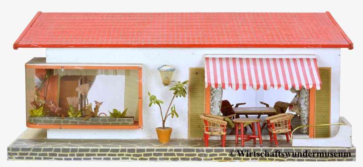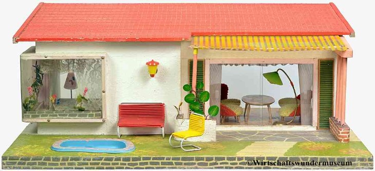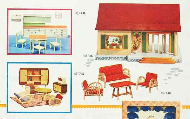 Aus einem Spielzeugkatalog von 1958: "Dieses große, moderne Puppenhaus hat 2 Zimmer und eine Veranda." – "Ich muss schon sagen, hier können Puppen aber wirklich modern wohnen!" Preis: DM 35