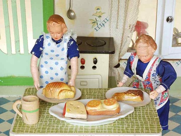 Wie im "richtigen Leben" – Puppenstubenwelt und Wirklichkeit: Während die Männer im Wohnzimmer über das neue Radio fachsimpeln, bereiten die Frauen das Essen vor.