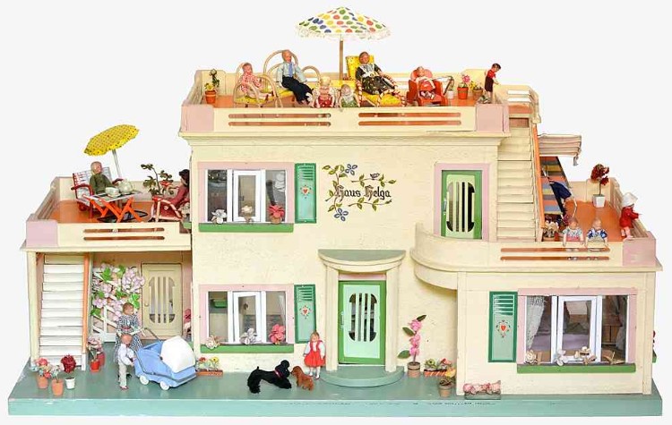 Puppenhaus „Haus Helga“ aus den 1950er Jahren – Hersteller ist die Holzspielwarenfabrik Albin Schönherr, Niederlauterstein / Erzgebirge (DDR), gegründet 1895 durch Albin Schönherr, einen ehemaligen Mitarbeiter des seinerzeit wohl renommiertesten Puppenhaus-Herstellers Moritz Gottschalk. Die Häuser wurden nach beliebten Mädchennamen ihrer Zeit benannt, so gibt es dieses Modell (z.T. mit geringfügigen Änderungen wie beispielsweise veränderten Türen) unter anderem noch als „Haus Ingrid“, „Haus Gisela“ oder „Haus Karin“. – Ich habe das Haus leer bekommen und mich bemüht, es zeittypisch einzurichten. Maße: 108 x 44 x 45 cm