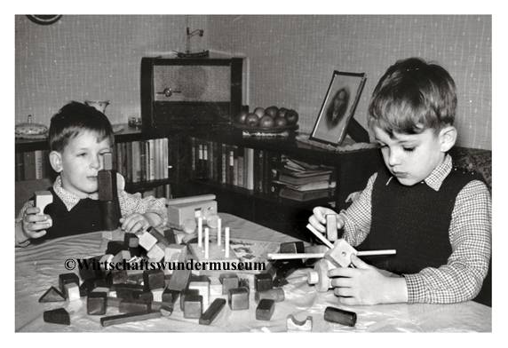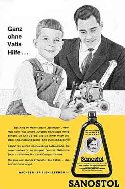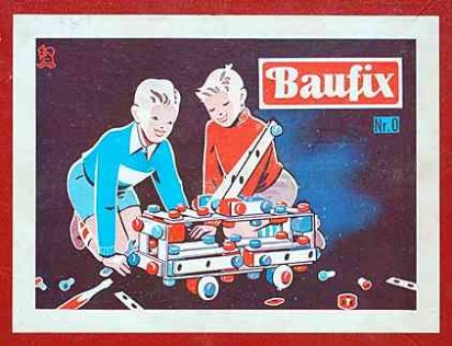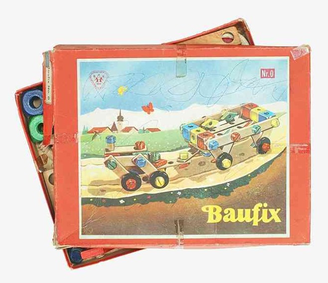 Baufix, ein weit verbreitetes Konstruktionsspiel mit zusammenschraubbaren Holzelementen – hier in einem von Kinderhand „aufgehübschten“ Karton mit typischen Altersspuren. Die Bauelemente waren seinerzeit so bekannt, dass sie 1962 in einer „Sanostol“- Werbung Verwendung fanden: ein Kran aus Baufix „ganz ohne Vatis Hilfe“.