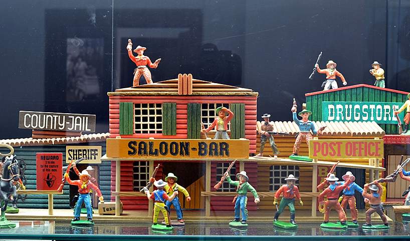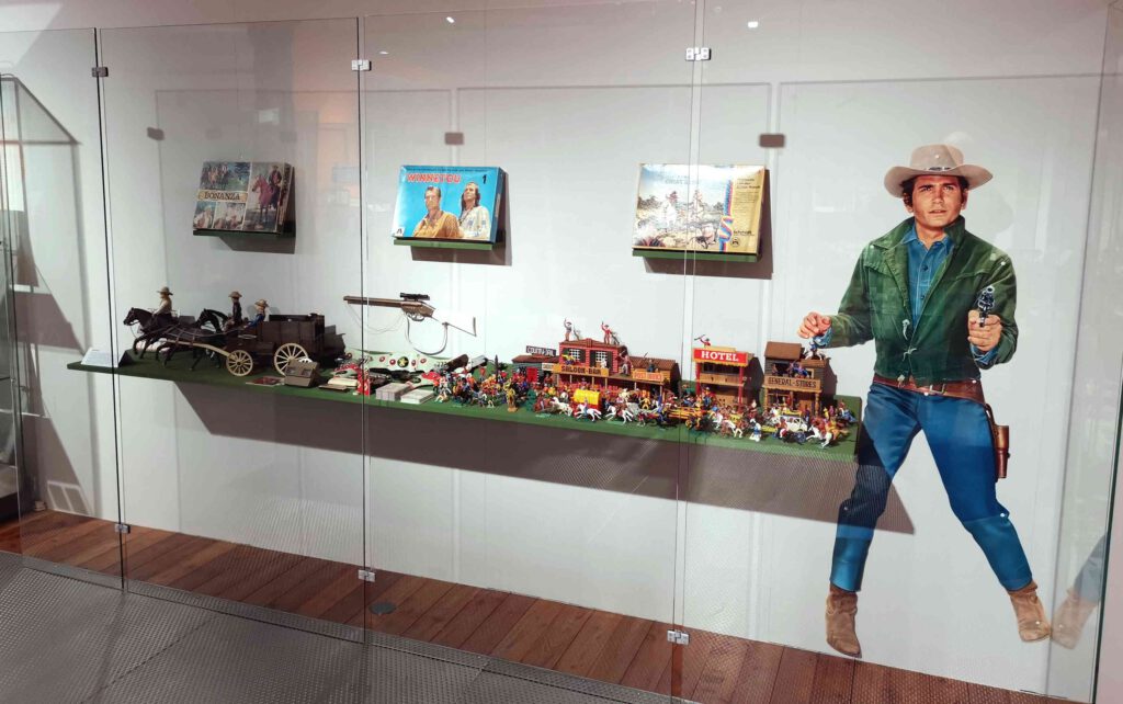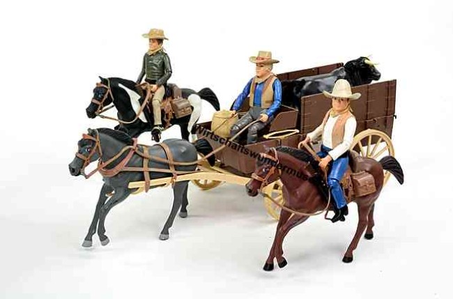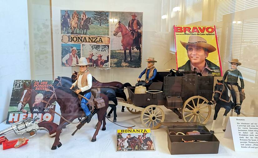 Die Cartwrights, die Helden meiner Kindheit, als Spielfiguren mit beweglichen Gelenken. Höhe jeweils ca. 22 cm (mit Hut;-) Statt Adam, der irgendwann ausgestiegen ist, um „seriöse“ Rollen zu spielen, ist als vierte Figur „Will“ dabei, ein Neffe von Ben Cartwright, der eigentlich Adam ersetzten sollte, es mangels entsprechender Publikumsresonanz aber nur auf fünf Bonanza-Folgen insgesamt brachte. Darum ist er hier auch nicht zu sehen. – Drumherum gibt es jede Menge Zubehör, von der Pferdetränke bis hin zum Essgeschirr. Zudem kann der Pferdewagen zum Planwagen umfunktioniert werden. – Vitrine im Rahmen meiner Ausstellung „Im Kinderzimmer wird’s orange!“