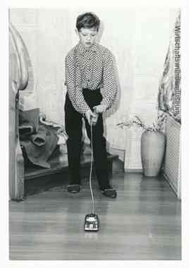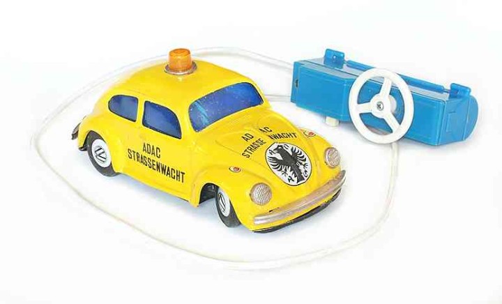Ein VW-Käfer der „ADAC Strassenwacht“ als Fernlenkauto / Spielzeugauto mit Kabelfernlenkung. „Ferngesteuert“ bedeutete in den 1960er Jahren etwas ganz anderes als heute: Die Übertragung der Fahrbefehle erfolgte nicht etwa über Funk, sondern über einen mit Plastik ummantelten Draht („Kabelfernsteuerung“), mit dem man das Auto lenken und vorwärts/ rückwärts fahren lassen konnte. Die Kabel waren meist so kurz, dass man sich selbst als Kind ein wenig bücken (und hinterherlaufen) musste und es derart auf Dauer eine recht anstrengende Angelegenheit war. Nichtsdestotrotz hat das Ganze großen Spaß gemacht (bis die Batterien leer waren) und war etwas ganz Besonderes!