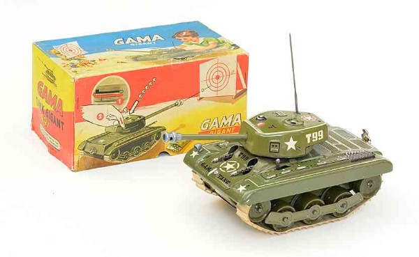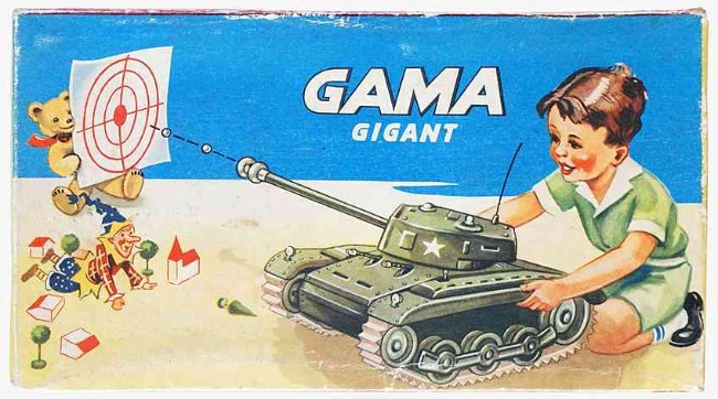 Ziemlich abartig finde ich, dass keine zwei Jahrzehnte nach Ende des Zweiten Weltkriegs Waffen derart verniedlicht wurden, wie auf der Deckelillustration des „Gigant“ Panzers der Firma GAMA. Obwohl die Beschriftung der Schachtel darauf hindeutet, dass dieses unschöne Teil insbesondere für den Export produziert wurde, belegt sein gelegentliches Auftauchen bei Internetauktionen oder auf Trödelmärkten, dass es wohl auch hierzulande Eltern gegeben haben muss, die ein Spielzeug gekauft haben, das per Rückzugsfeder kleine Stahlkugeln abfeuert und dessen ratternde Maschinengewehre Funken versprühen. – Eigentlich unfassbar.