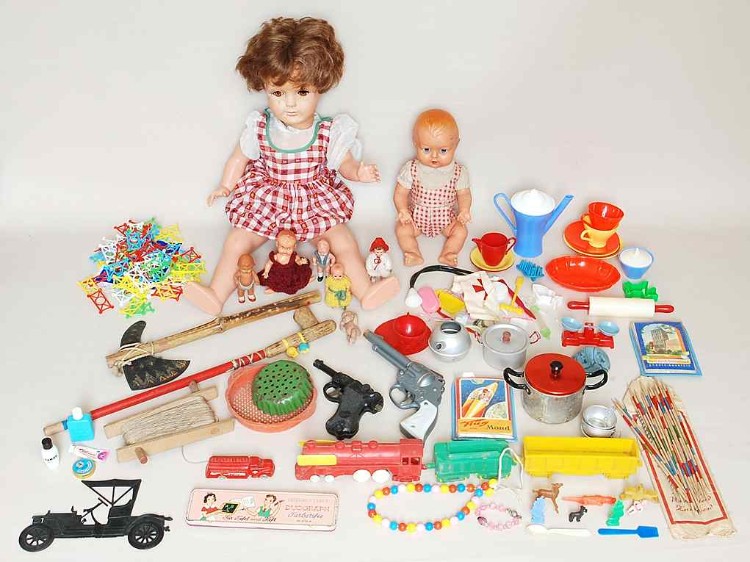 Unverfälschter Speicherfund: Inhalt einer Spielzeugkiste aus den 60ern mit einem Querschnitt typischen Jungen- und Mädchenspielzeugs von Tomahawk und Friedenspfeife über Sandkastensieb bis hin zum Spielgeschirr. Utensilien zum „Cowboy-und-Indianer-Spielen“ waren eigentlich für jeden Jungen ein Muss.
