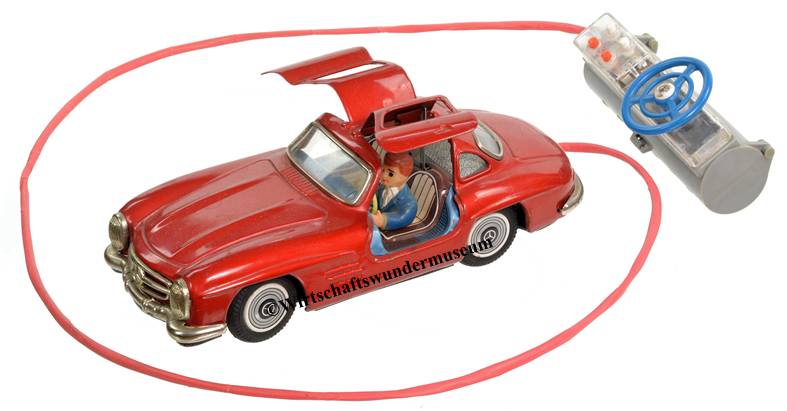 Bei diesem schicken Mercedes 300 SL des japanischen Herstellers Bandai lassen sich, zusätzlich zu den üblichen Fahrfunktionen, auch noch die Flügeltüren per Kabelfernbedienung öffnen und schließen! Länge ca. 22 cm