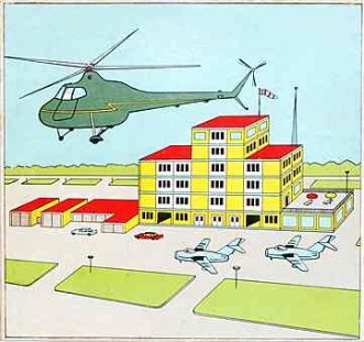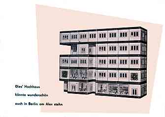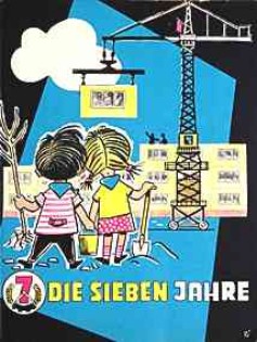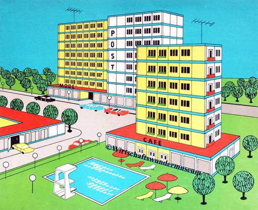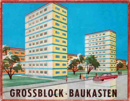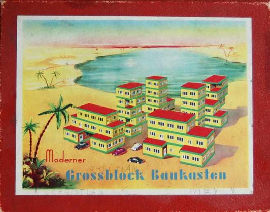 Zum Ausklang der 50er Jahre jedenfalls ist die Großblockbauweise die am weitesten verbreitete und so ist es nahe liegend, dass sich auch die Spielzeughersteller ihrer annehmen. Ein wohl ab 1958 von Manfred Schägner aus Tabarz im Thüringer Wald unter der Bezeichnung „Moderner Grossblock Baukasten“ hergestellter Steckbaukasten irritiert aber erst einmal durch sein Deckelbild, auf dem die Großblockbauten ausgerechnet an einen See inmitten einer Wüstenlandschaft platziert wurden. Was auf den ersten Blick nicht recht zusammenpassen will und sogar etwas bizarr anmutet, wird verständlicher, wenn man sich ein wenig eingehender mit den in vielen Büchern und Zeitschriften nachzulesenden Zukunftsvisionen dieser Zeit befasst, die als eine der größten technischen Herausforderungen der Menschheit die Urbarmachung der Wüste beschreiben: „Auch die Wüsten werden menschliche Behausungen aufweisen – nicht nur in den Oasen, und nicht nur bescheidene Dörfer. Zum Teil werden sie – durch klimatische Veränderungen großen Maßstabs … durch die Bewässerungen mithilfe der Atomenergie – in fruchtbare Gärten verwandelt und entsprechend besiedelt.“ So spiegelt die beschriebene Illustration also den Gipfel der damaligen Vorstellung von Fortschritt und mittendrin ist – natürlich – eine Großblocksiedlung.