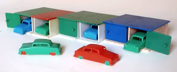 Als Hersteller für „Der moderne Grossblock – Baukasten“, „Ein neuzeitliches Spielzeug – belehrend und unterhaltend“, zeichnet nun die Firma Anni Friedrich, Kunststofferzeugnisse, verantwortlich, unter deren Namen auch noch Schägners Lagerbestände verkauft werden. Darüber hinaus präsentiert Friedrich das Stecksystem in einer eigenen, neu gestalteten Verkaufspackung, deren Deckelbild jetzt ein im Vergleich zur „Wüstenstadt“ realistischeres Szenario zu bieten hat – abgesehen von einem vor den Gebäuden parkenden überdimensionierten Straßenkreuzer, der in dieser Form wohl eher selten auf DDR-Straßen zu erblicken war… Im Laufe der nächsten Jahre erfolgte eine Überarbeitung der Kästen, die auf spätestens 1964 zu datieren ist. „Die vor Dir liegenden Bauteile sind die neuesten und modernsten ihrer Art“, schwärmt die beiliegende Anleitung, „mit Ihnen kannst Du Wohnblocks im Stile unserer Zeit bauen.“ Zwar blieben die Grundelemente gleich, doch variierten jetzt die Farben von Dachelementen und Verbindungsstegen. Außerdem wurde der Umfang des Zubehörs beträchtlich erweitert, sodass mit Garagen samt dazugehörigen Autos, Laternen zur Straßenbeleuchtung, Zäunen, Sonnenschirmen und Liegestühlen sowie diversen weiteren Accessoires wesentlich abwechslungsreichere Spielsituationen gestaltet werden konnten als bisher. Auch das Deckelbild wurde wiederum modernisiert und blieb bis zum Ende der Friedrichschen Grossblockfabrikation unverändert, während die Kartons selbst häufiger die Farbe wechselten. Ob dies verkaufstechnisch bewusst gemacht wurde oder auf materialbeschaffungsspezifische Gegebenheiten zurückzuführen war, ist nicht bekannt. Der Clou der Neuheiten waren jedoch kleine Bildchen, die die Auslagen verschiedener Geschäfte abbilden, auf die Rückseiten der glatten Wandelemente geklebt waren und so als „Schaufenster“ verbaut werden konnten. Ein Prospekt von 1967 kündigt noch einen Plastikbaukasten „Flughafen“ an, jedoch wird der Betrieb ein Jahr später in den VEB Preßwerk Tambach in Tambach-Dietharz „eingegliedert“, was schließlich das Ende der Firma bedeutet.