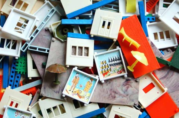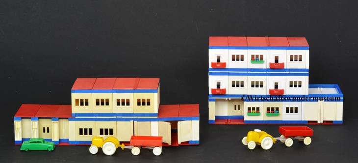 Gänzlich nebulös wird es dann schließlich in Bezug auf einen vierten „Grossblockbaukasten“ aus westdeutscher Produktion, der sogar der älteste von allen ist. Bereits 1955 stellte die Firma Rex Plastik GmbH aus Nürnberg, ein Tochterunternehmen von Blechspielzeugfabrikant Karl Arnold unter Leitung seines Schwiegersohns Max Ernst, im Rahmen der Nürnberger Spielwarenmesse mit „Der kleine Baumeister“ einen Baukasten vor, der wiederum die bekannten Grundelemente enthält. Die hohe Qualität des verwendeten Kunststoffs, der im Gegensatz zu den DDR-Erzeugnissen auch nach über einem halben Jahrhundert nicht die geringsten Anzeichen von Vergilbung zeigt, spricht für eine Herstellung in der Bundesrepublik. Dass Großblockbauweise dieser Art zu dieser Zeit in Westdeutschland eher unüblich war, lenkt die Spurensuche wiederum nach Deutschland-Ost. Aber auch wenn die seinerzeitigen Zusammenhänge leider wohl nicht mehr abschließend geklärt werden können, legen verschiedene Anhaltspunkte immerhin die Vermutung nahe, dass es bei der Konzeption des Rex-Baukastens Ost-West Kontakte gegeben haben könnte, die damals wie heute nicht an die große Glocke gehängt werden sollten, durften oder wollten …