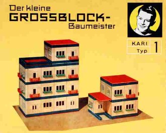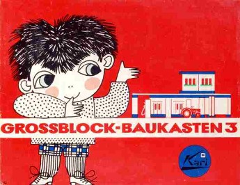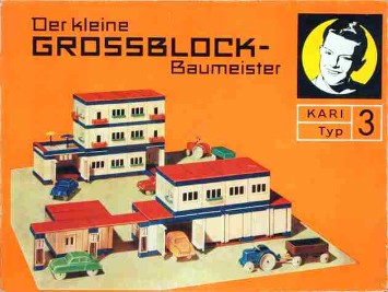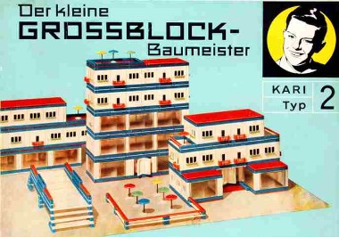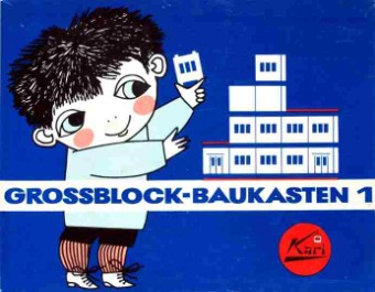 Der andere „Nachbauer“ des Tabarzer Kastens ist Karl Ribarsch in Waltershausen, dessen Produkt ebenfalls auf den exakt gleichen Grundelementen basiert und der sich durch eine unkonventionelle Gestaltung seiner Schachteln von der Konkurrenz abzuheben versucht. Statt auf die bisher üblichen realitätsbezogenen Darstellungen zu setzen, kommt auf seinen Kästen ein von R. und Eleonore Partzsch gezeichnetes „pfiffiges Kerlchen“ daher, das innerhalb der beigefügten mehrseitigen, grafisch recht originell gestalteten Anleitung in flotten Reimen im zeittypischem Sprachklang die vielfältigen Gestaltungsmöglichkeiten der Bauelemente erläutert: „Bild 1 zeigt einen Garagenbau – mit richt’gen Türen, du siehst es genau. – Ein Auto fährt gerade heraus – auch dieses Auto kannst du bauen, ei der Daus.“ In insgesamt drei Varianten bietet Ribarsch seinen Grossblock – Baukasten an. Kasten 1 enthält die Teile für das „normale“ Grossblockhaus, das mit den zusätzlichen Elementen sowie einigen Sonderteilen wie Drehtüren (!), großflächigen Fenstern und Treppen aus Kasten 2 zu einem „Hochhaus, Hotel oder Kaffeehaus“ erweitert werden kann. Kasten 3 beinhaltet Spezialteile zum Bau von „Groß-Tankstellen“ wie Garagentore, ein Auto und einen Traktor mit Anhänger. Leider verschwindet nach einigen Jahren (spätestens 1967) im Zuge einer optischen Neugestaltung der lustig reimende Knabe von den Baukastenkartons, stattdessen sind die aus dem jeweiligen Inhalt zu fertigenden Gebäude abgebildet. Von rechts oben lächelt dem Betrachter zwar erneut ein gezeichneter Junge entgegen, doch verkörpert dieser im Gegensatz zu seinem gewitzten Lausbuben-Vorgänger eher den Typ des ebenso braven wie langweiligen Musterknaben… Die Typenpalette der Baukästen jedenfalls wurde um zwei weitere auf nunmehr insgesamt fünf verschiedene Varianten erhöht. Neben den bereits zuvor beschriebenen kommt Typ 4 für „industrielles Bauen kleinerer Gebäude auf dem Land“ mit Dreiecksgiebeln, Sprossenfenstern sowie Dachelementen mit angedeuteten Dachziegeln hinzu. Komplettiert wird die Reihe durch „Kari Typ 5“, „Der kleine Gartenbau-Architekt“, mit dem sich „eine kleine Gartenbau-Ausstellung oder ein Kaffeehaus-Garten mit Blumenwiese“ arrangieren lassen. Ergänzend können jeweils noch Zusatzbeutel erstanden werden, passend zu Typ 5 beispielsweise der „Kari -Beutel ´Der kleine Gärtnermeister´“. Die wohl wichtigste Neuerung aber besteht in einer Änderung des Baukasten-Namens, der nun nicht mehr „Grossblock – Baukasten“ sondern „Der kleine Grossblock – Baumeister“ heißt. Letzteres ist durch den hohen Verbreitungsgrad der Ribarsch – Produkte auch heute noch das Synonym schlechthin für Baukästen dieser Machart aus DDR-Produktion.“ Wohl 1969 werden die Schachteln bunter. Die Abbildungen bleiben gleich, sind jetzt aber vor verschieden „knalligen“ Hintergrundfarben zu sehen, in denen auch die Kartons eingefärbt sind. Auf den Seitenlaschen der Deckel zeugen Übersetzungen ins polnische, französische und englische (Large Block Master Builder) davon, dass die DDR insbesondere im Spielwarenbereich beständig hohe Exportquoten nicht nur in die „sozialistischen Bruderländer“, sondern auch ins kapitalistische Ausland verzeichnen konnte.