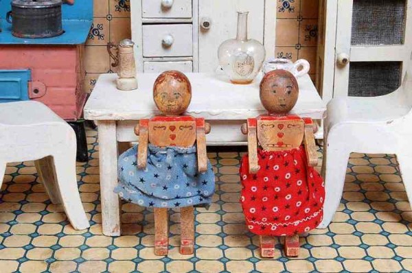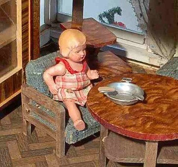 Während in den meisten mir bekannten Puppenstubensammlungen vorwiegend perfekt zusammengestellte Idealzimmer zu finden sind (wogegen grundsätzlich natürlich nichts zu sagen ist, denn das Sammeln soll ja in erster Linie Freude bereiten gemäß dem Motto: „Erlaubt ist, was gefällt.“), kommen bei mir auch Puppenstuben zu ihrem Recht, denen sofort anzusehen ist, dass sie Kinderspielzeuge waren – Spielspuren inklusive. Optimal ist natürlich, wenn ich die Stücke sogar noch von den ursprünglichen Besitzern erhalten habe und diese mir etwas dazu erzählen konnten!