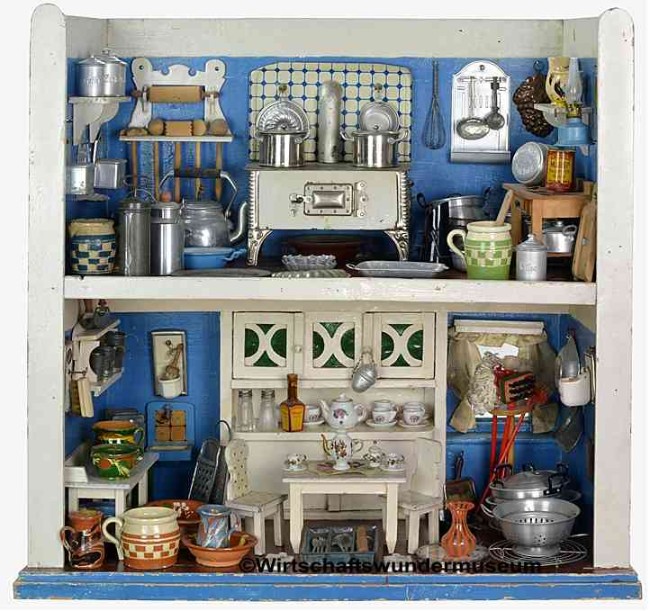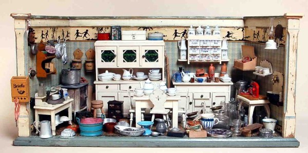 Reich bestückte Puppenküche in selbstgebautem Gehäuse um 1900, Maße: 62 x 30 x 58 cm. – Die ehemalige Besitzerin erzählte mir, dass die Küche inklusive Grundausstattung noch von ihrer Mutter (Jahrgang 1896) stammt, die Einrichtung von ihrer Tante in den 1920er Jahren ergänzt und von ihr selbst in den 1950er Jahren bespielt wurde.