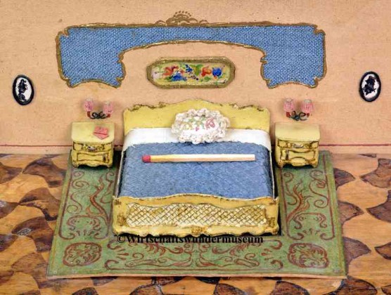 Bei diesen beiden Objekten handelt es sich wohl weniger um Puppenstuben, als vielmehr um handwerklich hochwertige Miniaturen. Die Bilder im Schlafzimmer sind „echte“ Gemälde, das Kissen ist bestickt und die Rückwand effektvoll mit Stoff strukturiert. Die äußerst detailgetreu gearbeiteten Möbel sind auf dem Boden festgeklebt. Der Boden wurde (augenscheinlich mit einem Stempel) bedruckt und weist zusätzlich eine Intarsienarbeit auf. – Maße: Schlafzimmer: 30 x 20 x 9 cm, „Herrenzimmer“ 23 x 17 x 10 cm