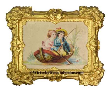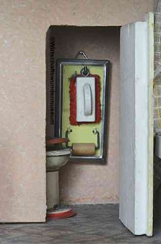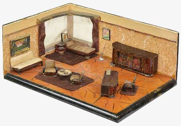 Gehäuse der Firma Albin Schönherr mit originellen selbstgebastelten Wohnzimmermöbeln und WC, wohl 1930/40er Jahre, Maße: 90 x 33 x 29 cm