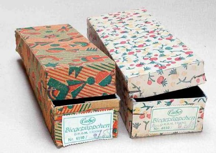 Caho (Caco)-Biegepüppchen – Im Jahre 1906 gründeten die Herren Canzler und Hoffmann eine Großhandels- und Exportfirma für Spielwaren. 1910 begannen sie mit einer eigenen Produktion von Puppenkleidern und Puppenzubehör. 1925 erfolgte die Eintragung des Warenzeichens „Caho“ (Canzler-Hoffmann). 1927 wurden die ersten biegbaren Püppchen hergestellt. – Nach den Kriegswirren gründete Fritz Canzler in Coburg seine unter dem Warenzeichen „Caco“ (Canzler-Coburg) bekannte Puppen- und Spielzeugwerkstätte.