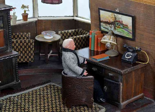 Der Herr des Hauses sitzt am Schreibtisch. Sehr schön ist einer der beiden Erker zu erkennen, die jeweils links und rechts an der oberen Etage angebracht sind.