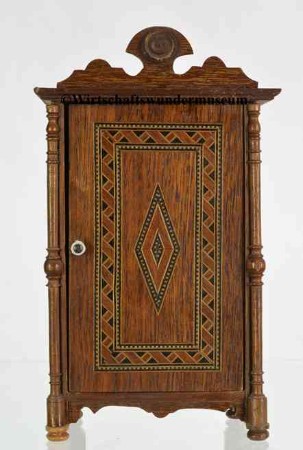 Puppenstube um 1900/10, zu 100 % original, d.h. im Fundzustand! Maße: 60 x 35 x 25 cm. – Tischplatte und Schranktür haben eine wunderschöne Intarsien-Optik, Schrankhöhe ca. 18 cm.