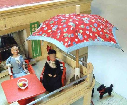 Originelles Detail: Als Sonnenschirm dient ein alter Puppenschirm, der in eine Wachskerzenhalterung gesteckt wird.