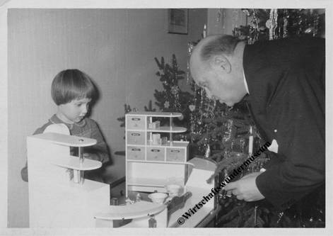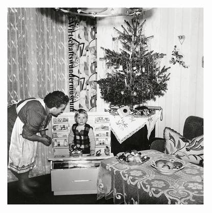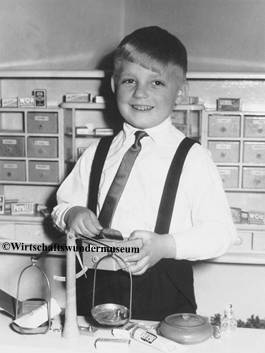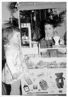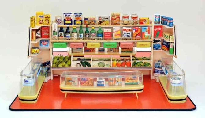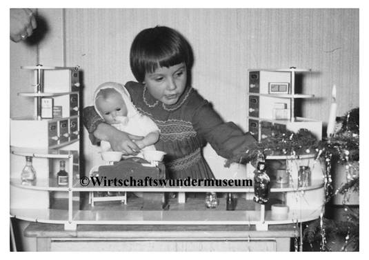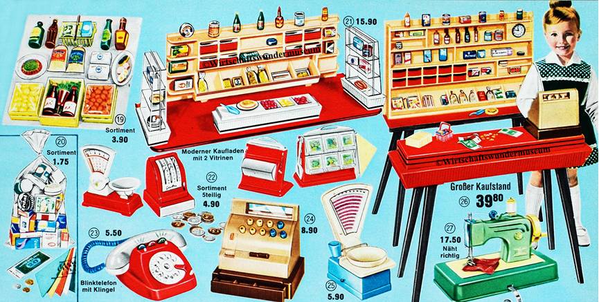 Die Spielkaufläden im Deutschland der Nachkriegszeit unterscheiden sich noch wenig von ihren Vorgängern aus den 1930er Jahren. Wie in den deutschen Wohnzimmern, in denen nahtlos an die „gute alte Zeit“ angeknüpft werden soll, als hätte es den Krieg nicht gegeben, und in denen die Möbel in den Nachkriegsjahren dem Geschmack ihrer Bewohner zufolge wie in den 1930ern in erster Linie solide, langlebig und möglichst auch repräsentativ sein sollen, ist in den Einkaufsstätten ebenfalls gediegene Zweckmäßigkeit angesagt. Meist findet man raumhohe hölzerne Wandregale und massive schwere Verkaufstheken, die wiederum auch in den Spielzeugläden zu entdecken sind. Einkaufen ist längst noch kein „Shopping“-Erlebnis wie heutzutage, sondern in der Regel eine schlichte Notwendigkeit. – Erst als es Mitte der Fünfziger Jahre dann einer breiteren Bevölkerungsschicht materiell besser geht, können sich die Menschen wieder mit Dingen beschäftigen, die über die Befriedigung der Grundbedürfnisse hinausgehen.