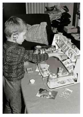 Standkaufladen der Firma Kindler & Briel (Kibri), um 1957. Platzbedarf ca. 90 x 52 x 92 cm. Da die originalen Bestückung leider nicht mehr vorhanden war, habe ich ihn eingerichtet mit einer Mischung aus Kinderkaufladen-Verpackungen und zeitgenössischen „echten“ Packungen und Warenproben, die nach Verbrauch des Inhalts oft eine Zweitverwertung in den Spielläden fanden. Ich bedanke mich für dieses tolle Stück und ebenso für das originale Foto ganz herzlich bei Patricia: „Dies ist mein alter Kaufladen von – glaub’ ich – 1957. Ich bekam ihn zu Weihnachten nach einem langen Krankenhausaufenthalt und war absolut selig darüber.“