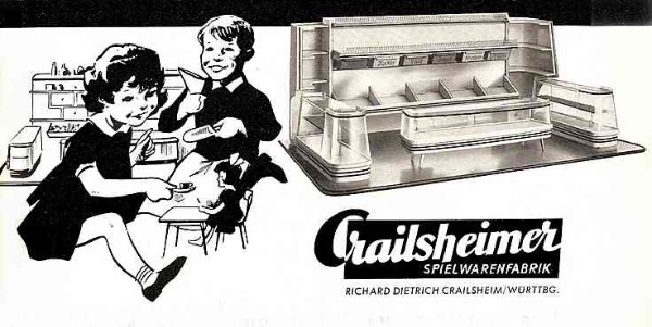 Oben/unten: Kaufläden und Werbung (1962) der „Crailsheimer Spielwarenfabrik Richard Dietrich Crailsheim/Württbg.“