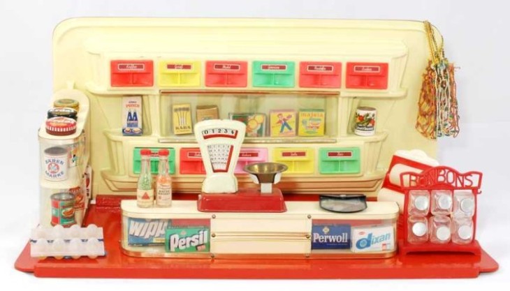 „Den Kaufladen habe ich als Kind bekommen, das war so um 1965. Der Kaufladen wurde immer zur Weihnachtszeit aufgebaut, war immer das Highlight für mich als Kind. Grüße Inge“. – Im Bestand fanden sich auch etliche, zeitlich in die 50er Jahre einzuordnende Einrichtungsgegenstände, sodass wohl, wie so oft, ein Kind Spielzeug von einem älteren Kind „geerbt“ hat. Die Füllung des tollen „Kaugummiautomaten“ und das Obst habe ich hinzugefügt, es passte so gut in diesen farbenfrohen Laden. Originales Obst/Gemüse ist heute so gut wie gar nicht mehr zu finden. Es war seinerzeit wohl in der Regel essbar, aus Marzipan oder Zuckermasse, und wurde entweder genüsslich verspeist, verdarb oder ist mittlerweile zerbröselt. Verpackt war das Ganze in einem Quelle-Karton (Nachnahme 16,30 DM) – offensichtlich war der Kaufladen per Katalog bestellbar. Maße: 70,5 x 29 x 22,5 cm