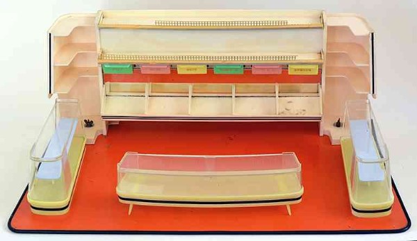 Sehr farbenfroher Kaufladen mit Holzboden und Plastikrückwand, gefunden in einem Karton vom „Ottoversand“. Er konnte in den frühen 60ern wohl dort per Katalog bestellt werden. Gefertigt wurde die Rückwand im seinerzeit innovativen „Vakuum-Tiefziehverfahren“, bei dem flüssiger Kunststoff durch Absaugen von Luft „wie von selbst“ über eine Form (in diesem Fall mit der Struktur der Rückwand) fließt. Nach dem Erkalten erhält man ein fertiges, sehr kostengünstig hergestelltes Bauelement. Maße: 60 x 29 x 28 cm