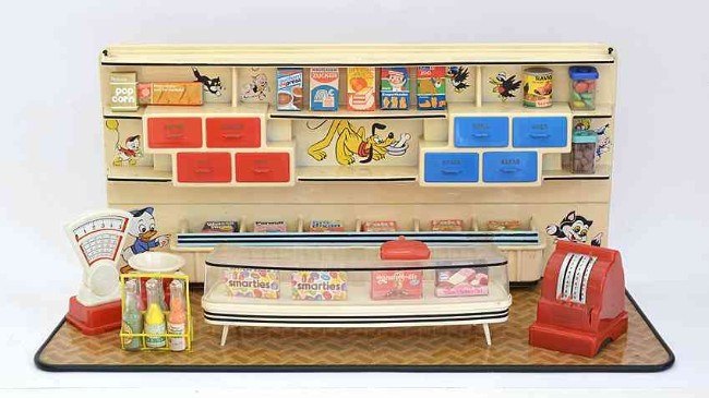 Kaufladen um 1968/70, Hersteller: Gebrüder Mathieu, „Werkstätten für Holz- und Plastikspielwaren“, Frankenthal/Pfalz, mit nachträglich angebrachten Walt Disney-Aufklebern. In der Theke Tiefkühlprodukte. Bemerkenswert: Der Fußboden des modernen Kaufladens wurde nachträglich mit einer Parketttapete beklebt… Früher war eben alles besser!? Maße: 65 x 28 x 28 cm