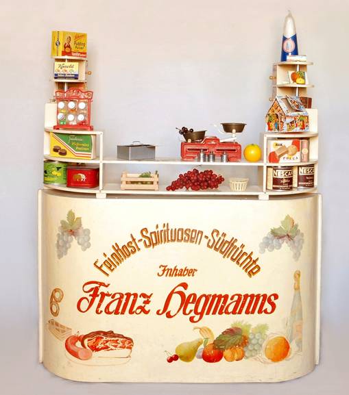 Ein Standkaufladen, der von privater Hand gekonnt mit verschiedenen Leckereien aus der Speisekammer bemalt wurde. Platzbedarf ca. 88 x 43 x 90 cm, die Bestückung wurde nachträglich zusammengestellt. Darauf, Südfrüchte kaufen zu können, waren die Bundesbürger besonders stolz und empfanden diese gar als eine Art Statussymbol. Als gegen Ende der 50er Jahre mit den ersten Nonstop-Flügen in die USA das Düsenzeitalter beginnt, ist man sogar weltweit der größte Importeur dieser exotischen Bereicherung des Speisezettels. – Die dicke Speckschicht des aufgemalten Räucherschinkens kann als Beleg für die nach den Mangeljahren der Nachkriegszeit einsetzende „Fresswelle“ gesehen werden. Im Bedürfnis, lang Entbehrtes nachzuholen, schossen die Bundesbürger bald über das Ziel hinaus. Fast noch wichtiger als die Qualität wurde nämlich die Quantität. Viel und fett zu essen galt als gesund und Übergewicht war Symbol des neu erworbenen Wohlstandes – was eindrucksvoll auch an Ludwig Erhard, dem „Vater des Wirtschaftswunders“, zu erkennen war.
