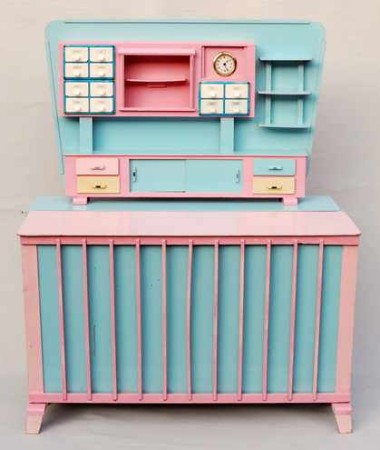 Kaufladen von Linus Dähnert/DDR, der in verschiedenen Varianten hergestellt wurde, so z.B. mit Glasregal auf der rechten Seite oder mit Lackierungen in anderen Pastellfarben. Um 1960, Maße 65 x 27,5 x 27 cm.