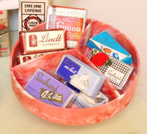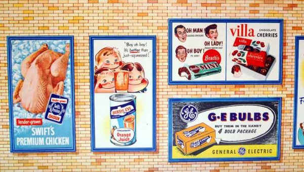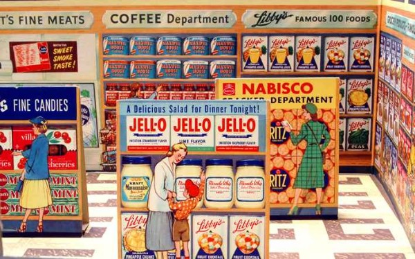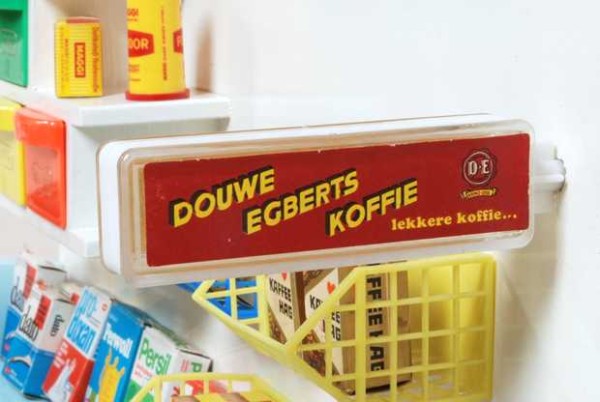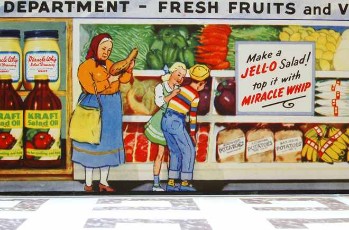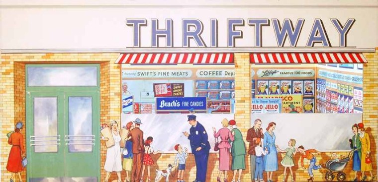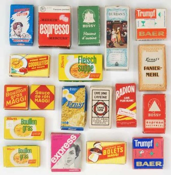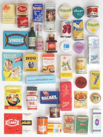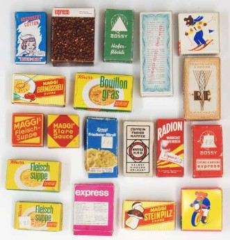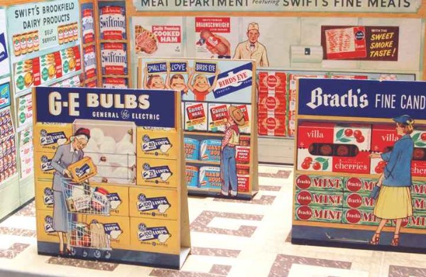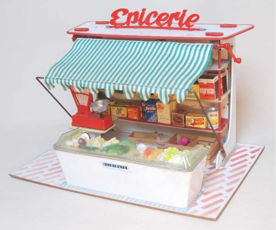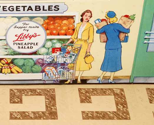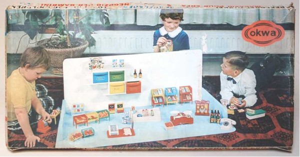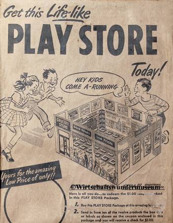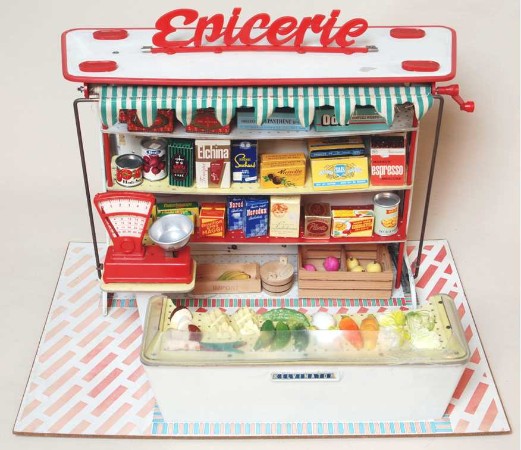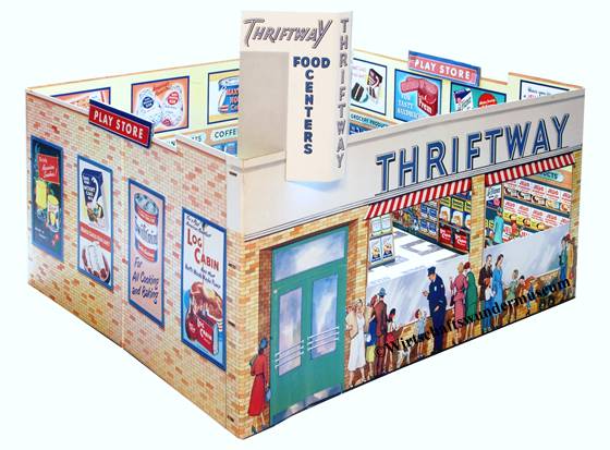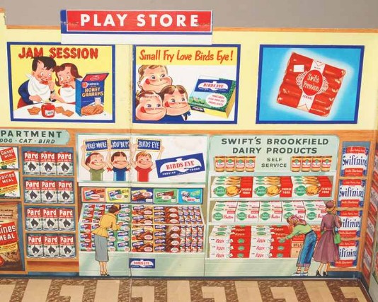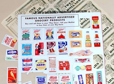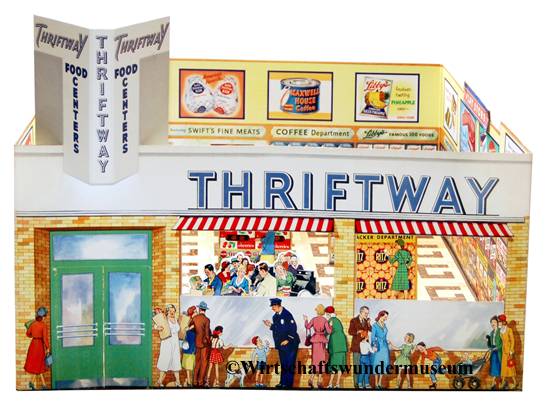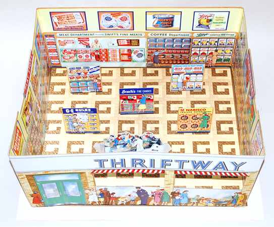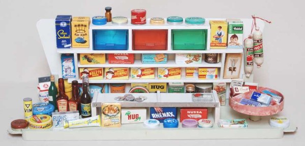 Thriftway Play Store Kinder-Kaufladen, „Made in USA“, Pappe / Papier, 1940er Jahre, Grundfläche des Fußbodens 60 x 70 cm, Höhe 30 cm. Dieser wirklich wunderschön illustrierte Kinder-Kaufladen, der einem Warenhaus der amerikanischen Kette „Thriftway“ nachempfunden ist, wurde in einer Papiertüte zum Preis von 1 $ verkauft und strotzt vor Zeitgeist. Hergestellt zu der Zeit, als die USA in den Zweiten Weltkrieg eingriffen, entdeckt man zum Beispiel die Aufforderung „Buy United States Defense Bonds“ (Kauft Kriegsanleihen) und findet Hinweistafeln, Waren aus US-Produktion zu bevorzugen. Auch wenn man die meisten der Waren hierzulande nicht kennt, ist der Laden nicht nur eine Augenweide, sondern auch ein Zeitzeugnis ersten Ranges!