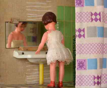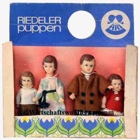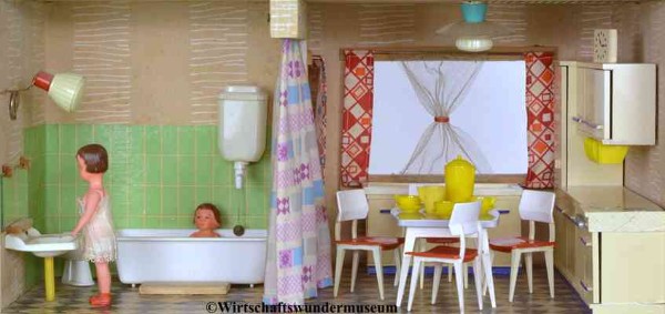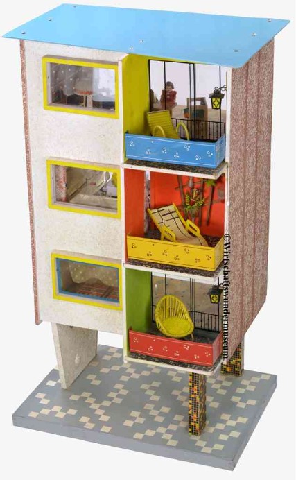 Bewohnt wird das Hochhaus von den in der DDR weit verbreitet gewesenen ARI-Puppenstubenpuppen (August Riedeler, Königssee). – Hersteller der Wohnzimmer- und Küchenmöbel: VEB Puppenmöbelwerk Seiffen
