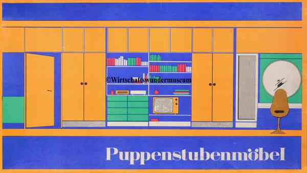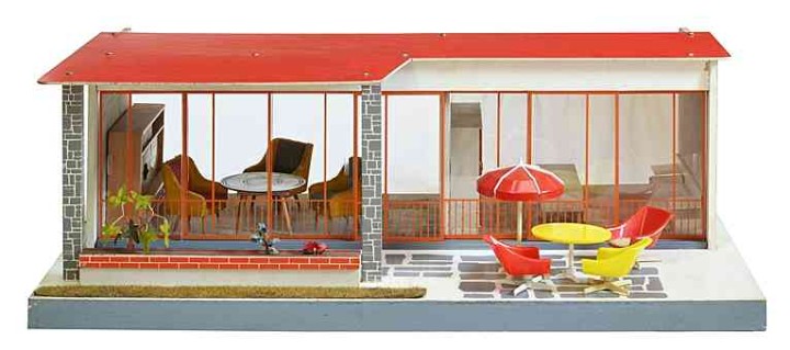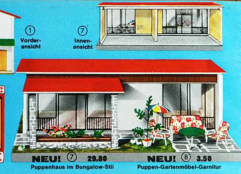 Puppenhaus-Bungalow, VERO, DDR, Maße: 75 x 48 x 26 cm. – Ein ganz ähnliches Puppenhaus ist im Quelle-Katalog Herbst/Winter 1968/69 zu finden: „Puppenhaus im Bungalow-Stil, stabile Holzverarbeitung. Zwei Zimmer in den Größen ca. 37 x 28 cm und ca. 32 x 28 cm. Vorderfront mit starken Glasschiebetüren, verschliffen. Gesamtlänge ca. 75 cm, Höhe ca. 25 cm. Ohne Puppen-Gartenmöbel DM 29,80“.
