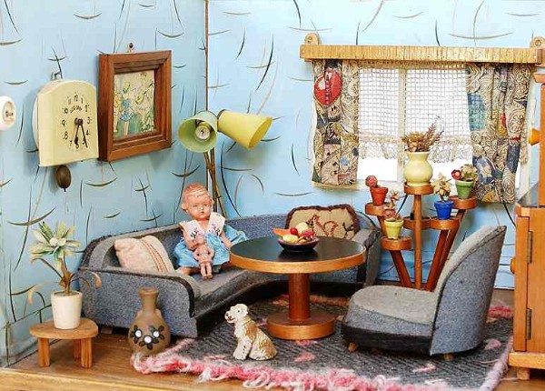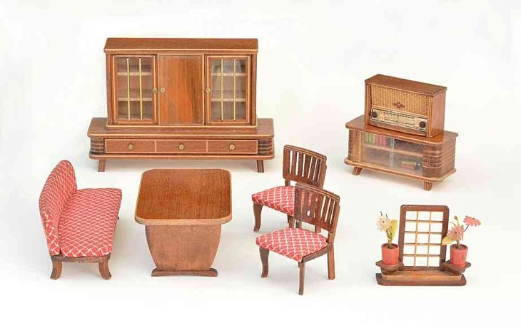 Eine zu 100 % im originalen Fundzustand befindliche, überwiegend selbstgebaute Puppenstube um 1955, die anschaulich die zu Beginn des Jahrzehntes noch altmodischen 1950er Jahre dokumentiert. In dieser Stube wird vor allem Wert auf praktischen Nutzen und Solidität der Einrichtung gelegt, modische Trends haben hier, abgesehen von Wohnzimmerlampe und -tapete, keinen Platz. Selbst der Blumenständer, in der Regel Symbol für eine neue Leichtigkeit, kommt eher rustikal daher. Maße: 96 x 32 x 22 cm.