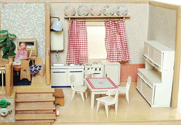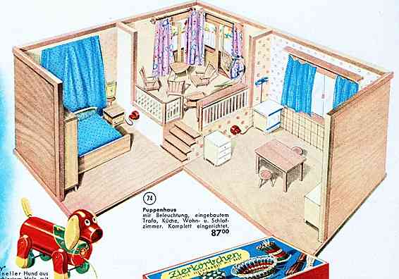 Abbildung aus einem zu Weihnachten 1954 erschienenen Spielzeugprospekt: „Puppenhaus mit Beleuchtung, eingebautem Trafo, Küche, Wohn- und Schlafzimmer. Komplett eingerichtet.“ Damaliger Preis: stolze 87 DM. Zum Vergleich: Der monatliche Brutto-Durchschnittsverdienst lag 1954 in der Bundesrepublik bei rund 353 DM.