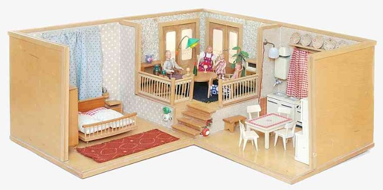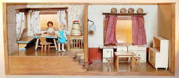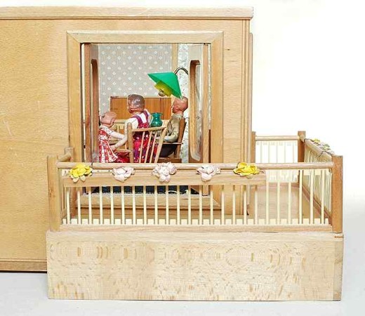 „Puppenhaus, bestehend aus drei Zimmern und Balkon mit Blumenkästen. Eine kleine Treppe verbindet das Wohnzimmer mit dem Schlafzimmer und der Küche. Die Fenster aus durchsichtigem Plastikmaterial und die Türen sind zu öffnen. Die Räume sind mit neuzeitlichen Möbeln wohnlich eingerichtet. Die modern gestalteten Lampen können an eine Batterie angeschlossen werden. Alle Holzteile sind verzapft, die Ausführung sehr solide und zweckentsprechend. Herbert Dohnalek oHG.,Westerburg/Westerwald“ (aus „Das Spielzeug“, 1954).  Maße: 64 x 64 x 28 cm, inklusive der hinter dem Wohnzimmer aufstellbaren Terrasse 71 x 71 x 28 cm