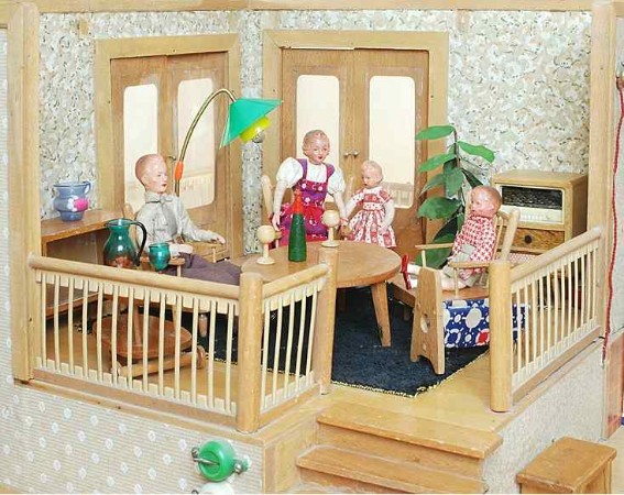 Arrangierte Szene: „Familie beim gemeinschaftlichen Radio hören“. Die Wohn- und Schlafzimmermöbel gehören zur originalen Dohnalek-Einrichtung, die Küche zumindest teilweise möglicherweise nicht – diese war aber schon drin, als ich das Haus bekommen habe. Auf dem Katalogbild unten kann man es leider nicht genau erkennen. Radioschrank, Lampe, Gummibaum, Zeitungsständer, Teppiche sowie diverse Kleinteile wurden von mir hinzugefügt.