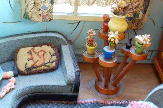 Ganz einfache, aus Holzresten zusammengezimmerte Puppenhausmöbel aus den Mangeljahren der Nachkriegszeit. Die "Bezüge" der Sitzmöbelpolster bestehen aus bemaltem Papier.