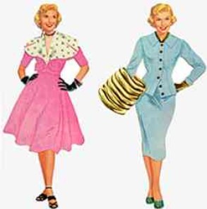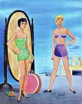 Dort stoßen sie zwar nie in die wirklichen Top-Positionen vor, aber immerhin machen Sally, Sue, Jean, Lois und viele weitere ihrer Papierpuppenkolleginnen eine gute Figur als Chefsekretärin, Lehrerin oder Stewardess. Die beiden mit Abstand beliebtesten Berufe sind jedoch Balletttänzerin und natürlich Model. Gerade Paper Doll Hefte letztgenannten Sujets haben neben konventioneller Garderobe auch durchaus schon mal das eine oder andere ausgefallenere Kleidungsstück zu bieten und ermöglichen derart eine bunt gefächerte Zeitreise in die damalige Welt der Mode. Dass nach amerikanischem Selbstverständnis ein guter Job dann letztlich doch nicht das alleinige Ziel junger Frauen darstellen kann, belegt die unüberschaubar hohe Zahl von Ankleidepuppen zum Thema Heiraten.