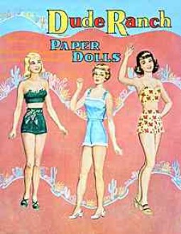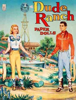 „Echte“ Cowboys kommen als Paper Dolls kaum vor, was nicht weiter verwunderlich ist, da Cowboys nicht eben den Ruf besitzen, mehrmals am Tag die Kleidung zu wechseln oder „für alle Fälle“ einen eleganten Anzug unter der Satteldecke parat zu haben und daher für diesen Spielzweck einfach nicht genug hergeben. Die „Dude Ranch“ hingegen hat den Vorteil, dass dort auch Frauen eine gute Figur machen können und so sind bei einem gleichnamigen Paper Doll neben dem abgebildeten Paar auf der Vorderseite noch einmal drei weibliche Papierpuppen auf der Rückseite des Covers zu entdecken. Für diese finden sich auf den Innenseiten entsprechende schicke Outfits mit jeder Menge Fransen, die die feinmotorischen Fähigkeiten des ausschneidenden Kindes auf eine harte Probe gestellt haben dürften und darüber hinaus natürlich etliche Kleider für abendliche Tanzveranstaltungen. Auch sonst tritt der „Wilde Westen“ meist nur als Rodeo-Show, selbstverständlich ebenfalls inklusive schmucker „Cowgirls“, in Erscheinung oder ist Thema in Heften über die Country-Sänger und Schauspieler Gene Autry und Roy Rogers, die Mitte der 30er in den USA als „Singing Cowboys“ zu großer Popularität gelangten.