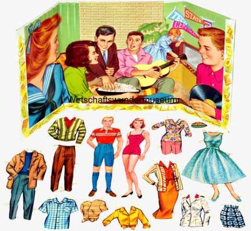 Das „Spiel mit Schere und Buntstift“ wurde auf die Rückseiten von nicht genutzten IBM-Lochkarten aus den Beständen der US Air Force gedruckt, zudem müssen die Kleidungsstücke erst ausgemalt werden. Bei einer Papierpuppe aus der DDR hingegen ist bei genauerer Betrachtung ein Beispiel versteckter Systemkritik auszumachen: So ist in diesem Fall ein unter den Arm geklemmtes Radioprogramm zu erkennen, auf dem Titel staatskonformer Sendebeiträge wie „sowjetische Künstler musizieren“ zu entziffern sind. Unter dem anderen Arm steckt eine Zeitung, von deren Namen nur drei Buchstaben erkennbar sind. Diese lassen jedoch als Schluss zu, dass es sich um den Eulenspiegel handelt, das seinerzeit einzige Satiremagazin der DDR.