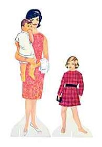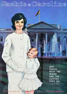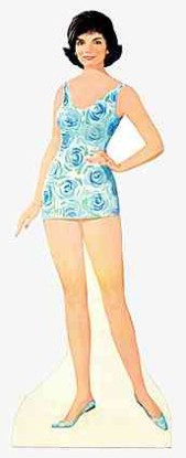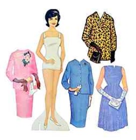 Eines der spektakulärsten Paper Dolls überhaupt hingegen zollt einer ungekrönten Königin den ihr zustehenden Tribut. Eine 1963 angebotene Jackie-Kennedy-Puppe der Magic Wand Corporation aus starker Pappe misst eine Höhe von sage und schreibe 75 Zentimetern und wird damit auch größenmäßig der überragenden gesellschaftlichen Bedeutung ihres realen Vorbildes gerecht. Als zusätzliche Besonderheit kann auf die üblichen, zur Befestigung der Kleidungsstücke umzuknickenden Papierlaschen verzichtet werden, da die Garderobe auch ohne diese Hilfsmittel an der beeindruckend großen Jackie-Vorlage haften bleibt. Die Gründe für diesen Effekt sind jedoch nicht, wie ein Verpackungsaufdruck die Kinder glauben machen möchte, auf einen kleinen, roten beiliegenden Plastik-Zauberstab zurückzuführen, sondern beruhen in diesem Fall ganz ungeheimnisvoll auf der Adhäsion, der Anziehungskraft der Moleküle zwischen zwei glatten Materialien. Auch bei anderen Firmen sind in den 60ern vermehrt Papierpuppen zu finden, die nach demselben Prinzip funktionieren und aus produktionstechnischen Gründen nicht mehr in Heftform, sondern in Schachteln („boxed sets)“ verpackt angeboten werden.