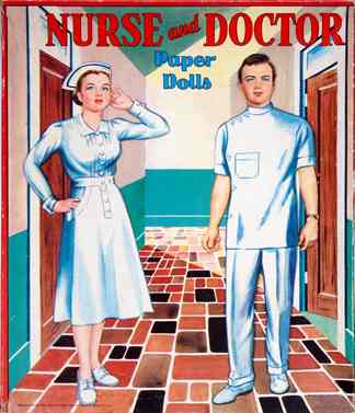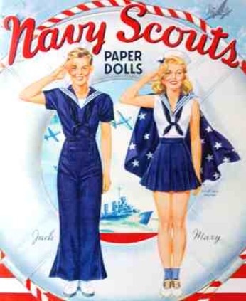 In den frühen 1940er Jahren erreichen die Verkaufszahlen der Papierpuppen in Amerika ihren Zenit. Einen nicht geringen Anteil daran besitzen ohne Zweifel die zeitgleich mit dem Eingreifen der USA in den Zweiten Weltkrieg in vielerlei Varianten auftauchenden Ausschneidehefte militärisch-patriotischen Inhalts. Während es scheinbar keine Probleme bereitete, Jungen durch Ausschneide- und Bastelbögen mit Soldaten und Panzern ohne Umschweife für das Kriegsgeschehen zu begeistern, versuchte man den Mädchen diese Angelegenheit über verschiedenerlei Umwege schmackhaft zu machen. Folglich verpackt der weitaus größte Teil derartiger Paper Dolls seine Botschaft in „mädchentypische“ Themen. So dreht sich in Titeln wie „Army and Navy Wedding Party“ oder „Military Wedding“ das Geschehen ums Heiraten, „Dolls in Uniforms of the U.S.A“ und „Girls in Uniform“ vermitteln, dass er sich auch in militärischem Outfit durchaus weiblich und schick aussehen lässt. Ausschneidehefte wie „Army Nurse“ ermöglichen den spielenden Mädchen, sich wie eine Krankenschwester zu fühlen. Auch für die Allerkleinsten ist gesorgt: In einem Band mit dem Titel „Uncle Sam’s little Helpers“ haben selbst puppenköpfige Kleinkinder und sogar ein „süßes Kätzchen“ offensichtlichen Spaß am Tragen von Uniformen. Ob bei „Victory Paper Dolls“, „Junior Volunteers“, „Our Soldiers – Cut Out Army Uniforms“ oder „Navy Scouts“, stets zeugen die freudig strahlenden Gesichter der Paper Doll Figuren davon, wie schön und befriedigend es offensichtlich ist, im Krieg zu sein.