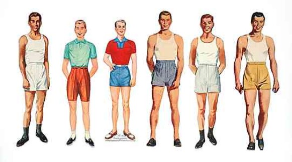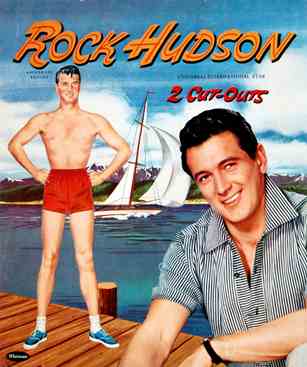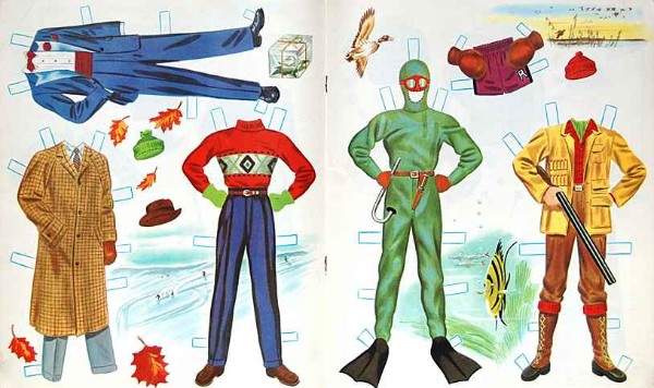 Vergleichsweise klein ist der Anteil an männlichen Schauspielern. Die es denn aber zu Paper-Doll-Ehren gebracht haben, sind zu den wirklichen Leinwandikonen zu zählen. So kann man Charlie Chaplin ebenso komplett neu einkleiden wie James „Jimmy“ Stewart oder Rock Hudson, dem offensichtlich ein sportliches Image verpasst werden sollte und für den deshalb neben locker-lässiger Freizeitkleidung und verschiedenen Filmoutfits sogar Boxhandschuhe und ein kompletter Taucheranzug vorhanden sind. Hollywood-Beau Clark Gable bekommt man gleich in mehreren verschiedenen Versionen, dafür jedoch immer nur im Doppelpack mit Vivian Leigh, seiner nicht minder attraktiven Partnerin im Kinoklassiker „Vom Winde verweht.“ Mittelpunkt einiger Dutzend Ausschneidehefte und damit absoluter Favorit im Papierpuppenkosmos war mit Kinderstar Shirley Temple eine Schauspielerin, die bereits im zarten Alter von sechs Jahren einen Oscar gewann, damit bis heute die jüngste Preisträgerin überhaupt ist und gleich mehrere Zielgruppen ansprach. Nahm sie für gleichaltrige Kinder die Rolle eine Freundin ein, bedeutete sie für viele Erwachsenen einen Lichtblick am dunklen Horizont der Depressionszeit. So erreichten nicht nur entsprechende Paper Dolls hohe Verkaufszahlen, sondern auch Shirley-Temple-Puppen, zudem wurde ihre Breitband-Popularität mit großem kommerziellem Erfolg in der Werbung eingesetzt. Viele insbesondere der Star-Ausschneidehefte bieten in den 50er Jahren zudem ein attraktives Extra: Hollywood-Beau Clark Gable bekommt man gleich in mehreren verschiedenen Versionen, dafür jedoch immer nur im Doppelpack mit Vivian Leigh, seiner nicht minder attraktiven Partnerin im Kinoklassiker „Vom Winde verweht.“ Mittelpunkt einiger Dutzend Ausschneidehefte und damit absoluter Favorit im Papierpuppenkosmos war mit Kinderstar Shirley Temple eine Schauspielerin, die bereits im zarten Alter von sechs Jahren einen Oscar gewann, damit bis heute die jüngste Preisträgerin überhaupt ist und gleich mehrere Zielgruppen ansprach. Nahm sie für gleichaltrige Kinder die Rolle eine Freundin ein, bedeutete sie für viele Erwachsenen einen Lichtblick am dunklen Horizont der Depressionszeit. So erreichten nicht nur entsprechende Paper Dolls hohe Verkaufszahlen, sondern auch Shirley-Temple-Puppen, zudem wurde ihre Breitband-Popularität mit großem kommerziellem Erfolg in der Werbung eingesetzt. Viele insbesondere der Star-Ausschneidehefte bieten in den 50er Jahren zudem ein attraktives Extra: Da die Innenseiten zudem einen horizontalen Schnitt aufweisen, entstehen Papiertaschen, die anschließend zur Aufbewahrung der Paper Dolls samt Accessoires genutzt werden können. Nicht wenige dieser Blätter sind derart gefällig illustriert, dass sie bereits für sich genommen schon als sammelwürdig erscheinen.