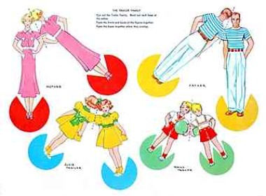 Als ganz besonders reizvoll entpuppen sich jedoch Paper Dolls, die die Welt der Heranwachsenden und der Erwachsenen abbilden. Im Gegensatz zu vielen Bereichen amerikanischer Kunst und Kultur, in denen sich als Auswirkungen der Wirtschaftskrise sozialkritische Töne und Politisierungen breit machten, handelt es sich bei der zweidimensionalen Welt aus Papier ausnahmslos um eine vollkommen heile, in der die „Große Depression“ nicht vorkommt. Dennoch oder vielleicht gerade deshalb ist dieser amerikanische Blick durch die rosarote nationale Brille von hoher Aussagekraft, wie beispielsweise das Heft „The Family and their Trailer“ der Merrill Publishing Company aus dem Jahr 1938 zeigt: