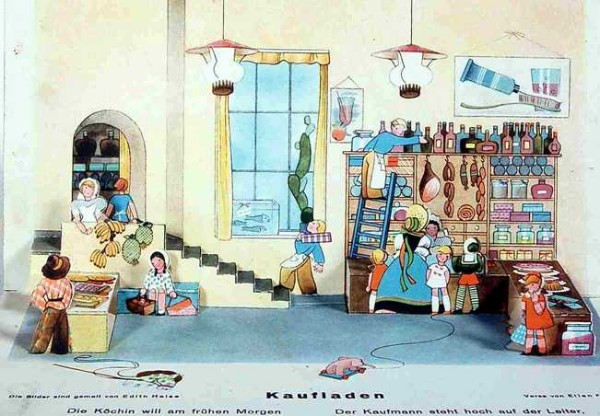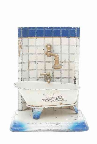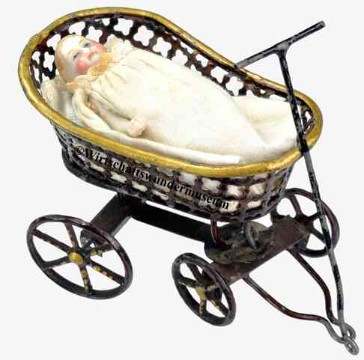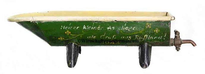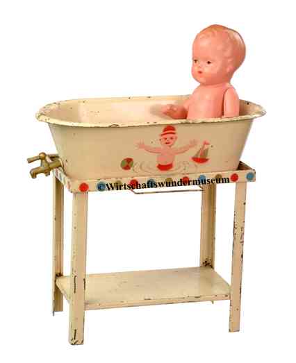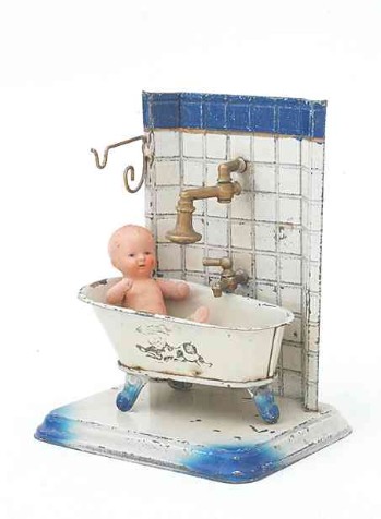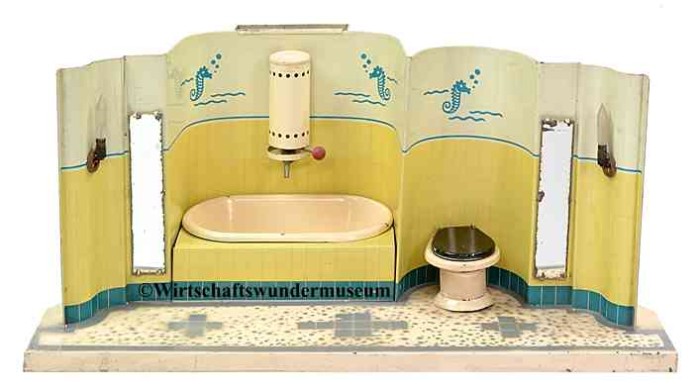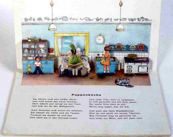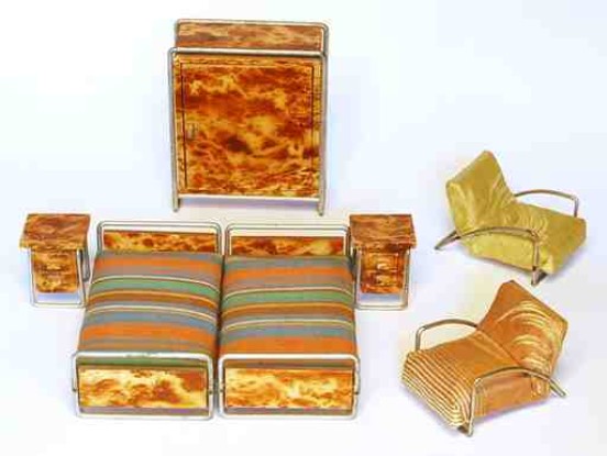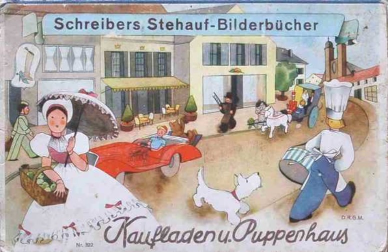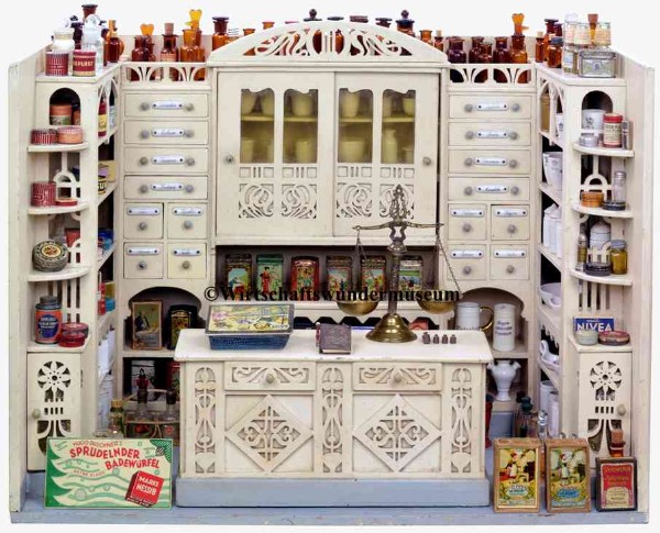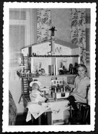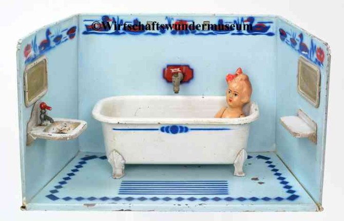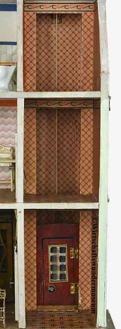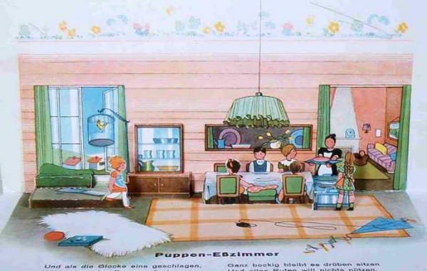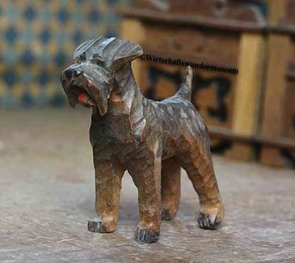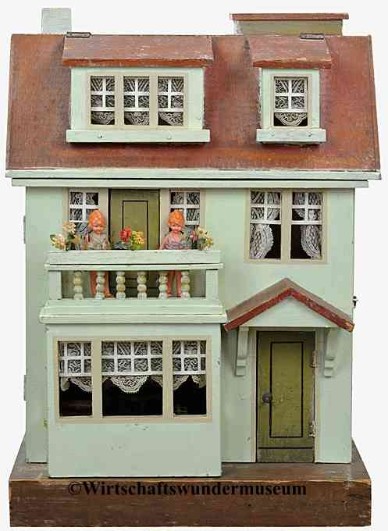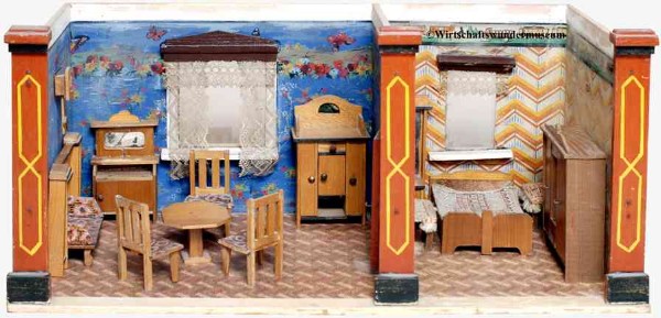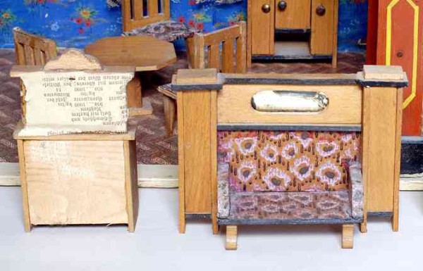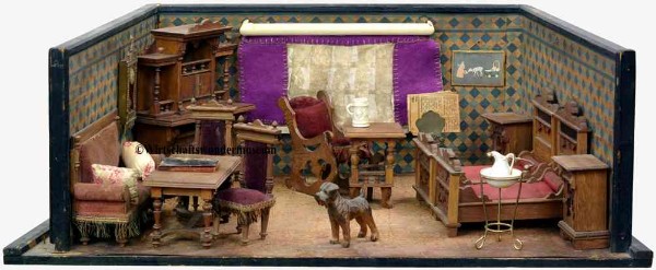 Diese Puppenstube um 1900 befand sich schon etliche Jahre in meinem Besitz, ohne dass sie es in das virtuelle Museum geschafft hätte. Ich hatte sie mal gekauft, weil sie noch unverfälscht erhalten war und – weil sich einfach die Gelegenheit ergeben hatte. Viel damit anfangen konnte ich jedoch nicht – war seinerzeit vom Stil her nicht wirklich meine Epoche – und so landete sie im Laufe der Zeit in der zweiten Reihe und geriet in Vergessenheit. Also beschloss ich dann schließlich irgendwann, sie an andere Sammler weiterzugeben. Aber wie es so geht: Als sie ein paar Tage in meinem Sichtfeld stand, ich die Möbel öfter mal hin und her gerückt und regelrecht damit „gespielt“ habe, gefiel mir ihr raubauziger Charme plötzlich immer mehr. So sehr, dass ich die Stube letztendlich doch behalten habe. –Im Hintergrund dient übrigens ein antiker Visitenkartenhalter als Zeitungsständer. Ganz besonders gefällt mir der handgeschnitzte Hund, der sehr gut getroffen ist. Maße: 65 x 42 x 22 cm.