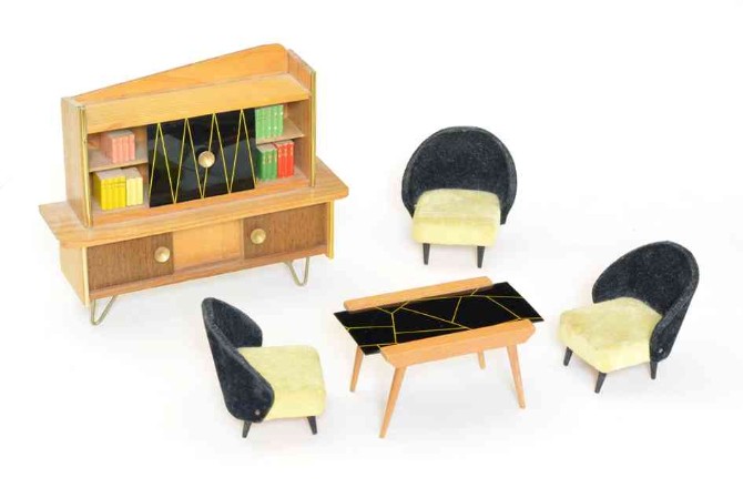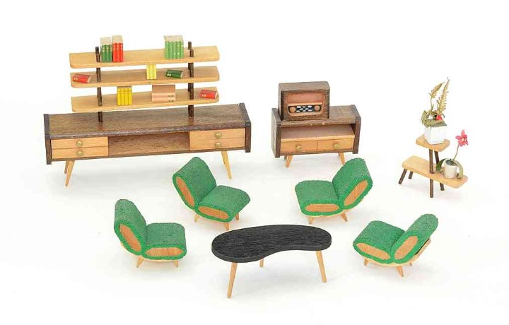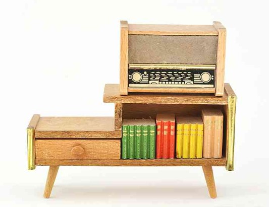 Radio und Blumenständer (inklusive klotzigem, etwas unproportioniertem Blumenkübel) sind in einem EMS-Katalog von 1959 abgebildet und gehörten offenbar zum Lieferprogramm, ebenso wie Lampe und Vase auf dem rechten Bild.