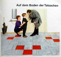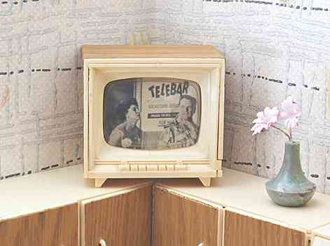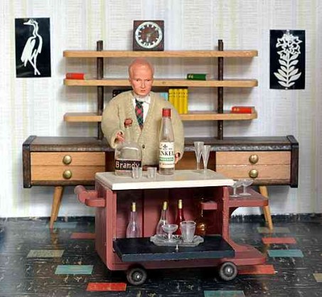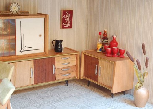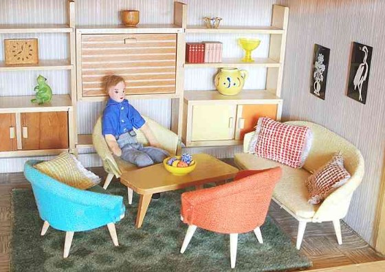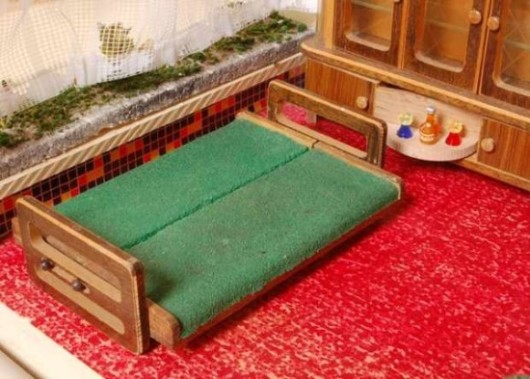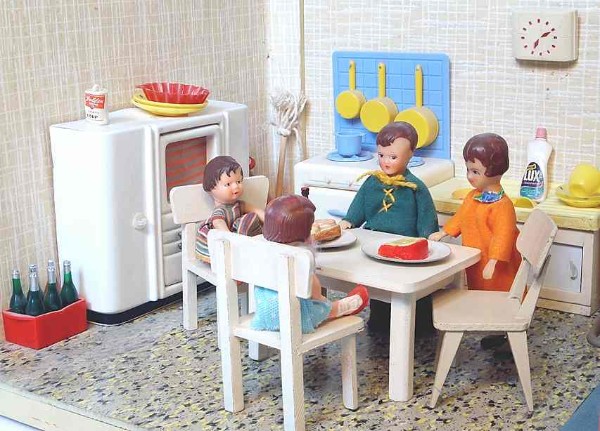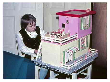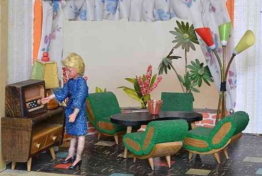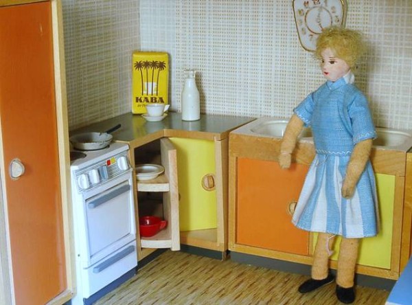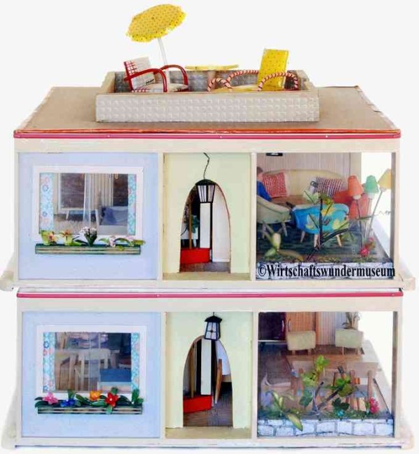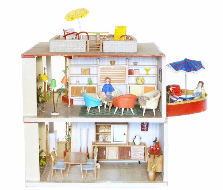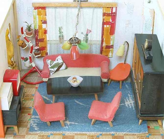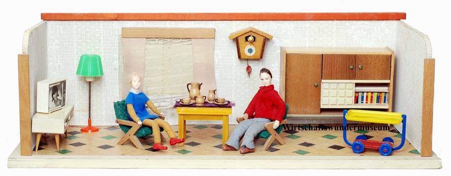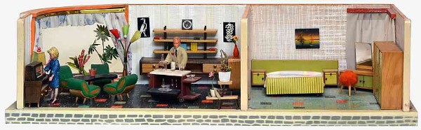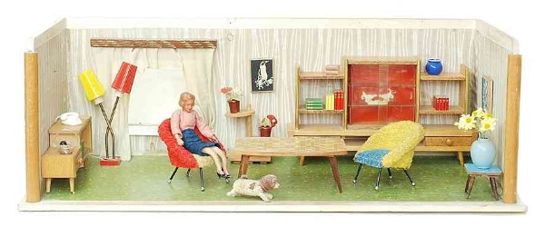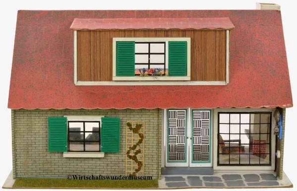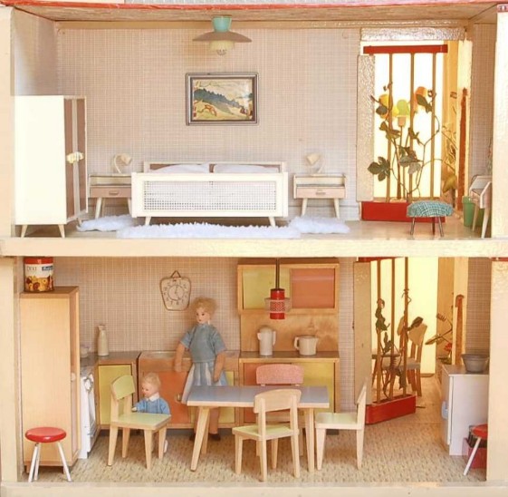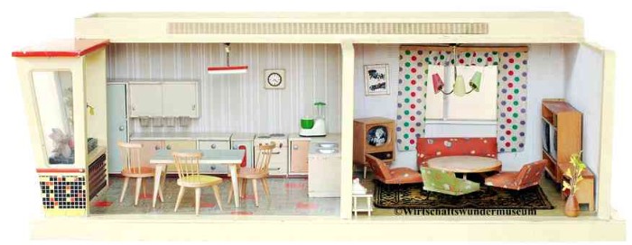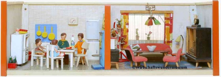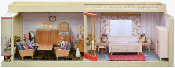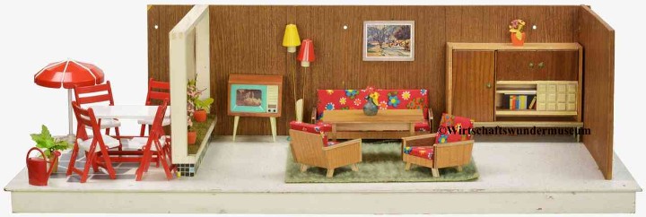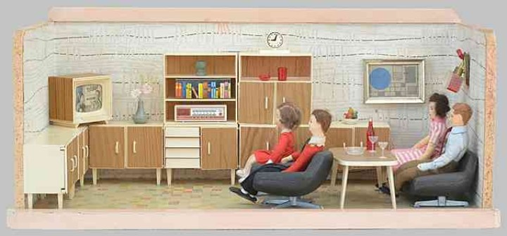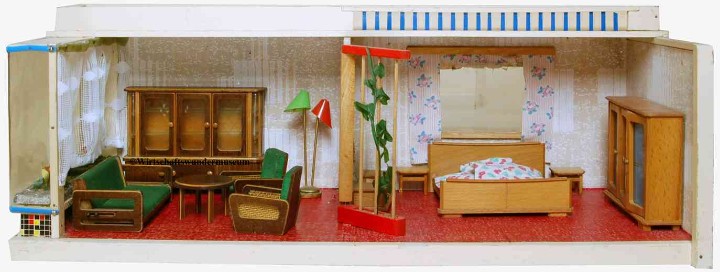 „Zerlegbare Puppenstube“, DDR, 1965, gefunden auf dem Sperrmüll in Weimar. – Nach der „Wende“, zu einer Zeit, als noch die Meinung in vielen Köpfen vorherrschte, alles Alte sei plötzlich nicht mehr gut genug und müsse entsorgt werden… Die Möbel habe ich seinerzeit nach Gutdünken hinzugefügt. Aus meiner heutigen Sicht ist ein „Kuddelmuddel“ entstanden, das meinen aktuellen musealen Ansprüchen in keinster Weise mehr gerecht wird. Kurioserweise ist es – zumindest vom optischen Gesamteindruck her – trotzdem recht stimmig geworden und so lasse ich die Bilder einfach mal online, bis ich die Einrichtung vielleicht irgendwann einmal überarbeite. Maße 69 x 31 x 24 cm