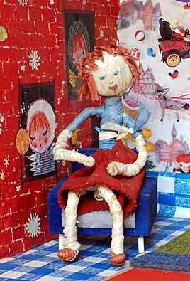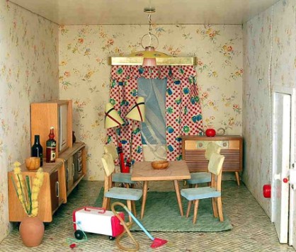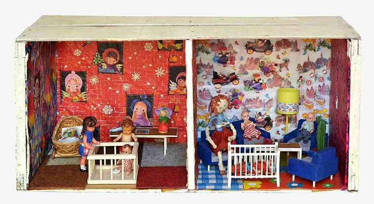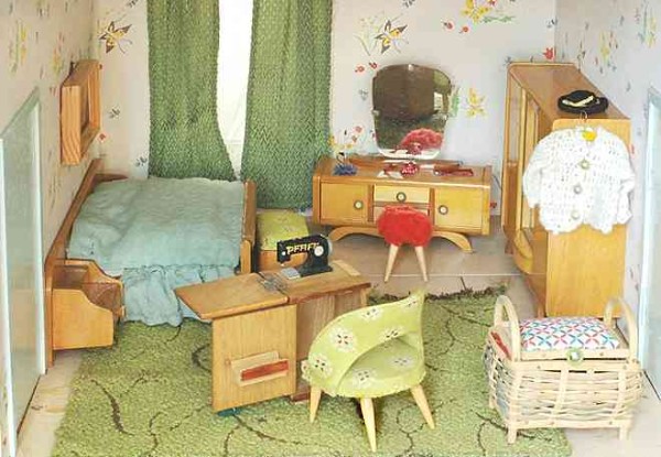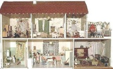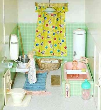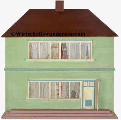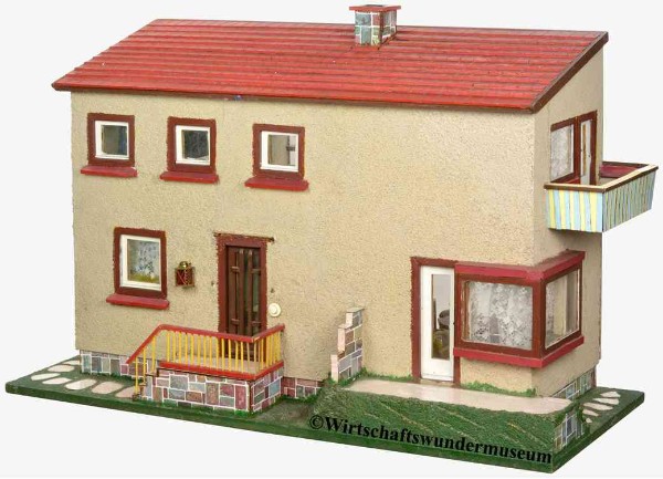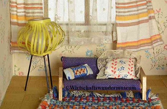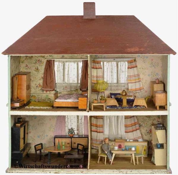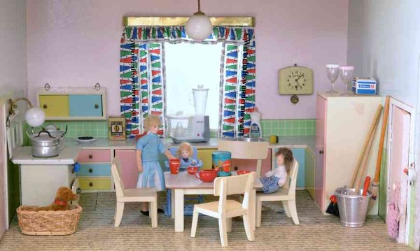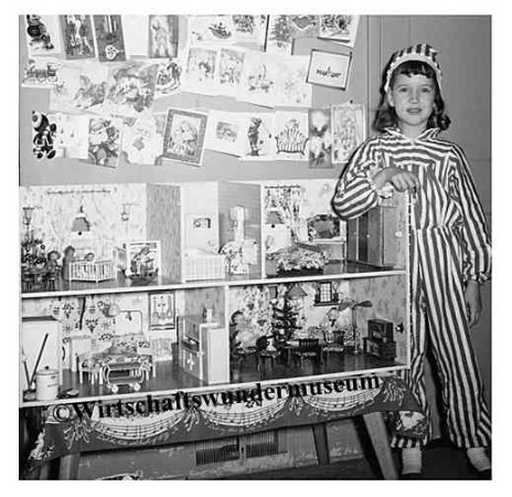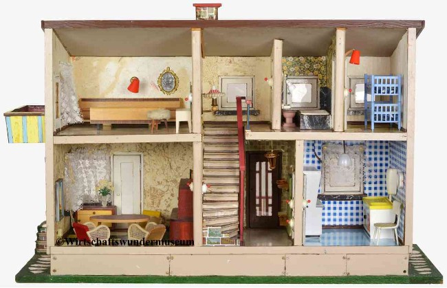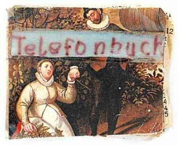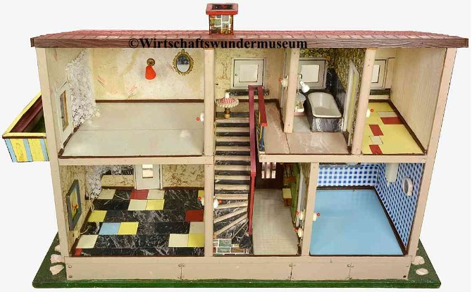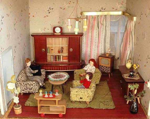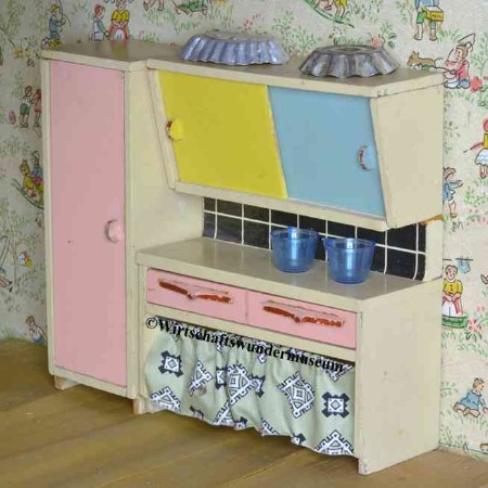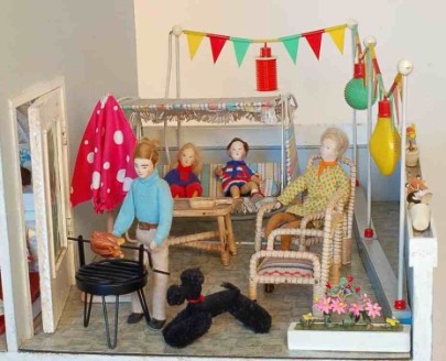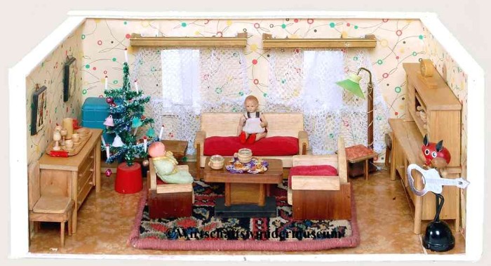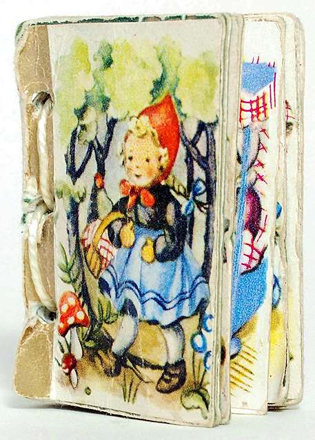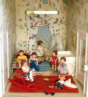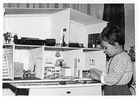 Im Gegensatz zu vielen Sammlern, die ausschließlich Objekte wertschätzen, die sie irgendwelchen – wenn möglich namhaften – Herstellern zuordnen können, empfinde ich es als Glücksfall, wenn es in einer Puppenstube selbst gemachte Accessoires zu entdecken gibt wie z.B. das hier zu sehende Bilderbuch.- Warum ein Kind auf die Idee kam, das abgebildete „Telefonbuch“ nicht dem Vorbild nachzuempfinden, weiß ich leider nicht. Vielleicht war ihm der gelbe Einheitslook zu langweilig? Auf jeden Fall ist dieses Bastelobjekt ein schöner Beleg dafür, dass Kinder die Welt einfach mit anderen, phantasievolleren Augen sehen und noch nicht so festgelegt / festgefahren sind wie Erwachsene.