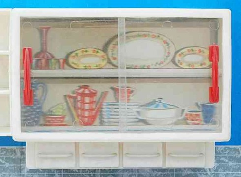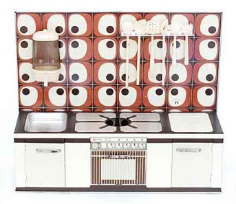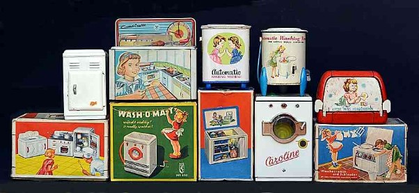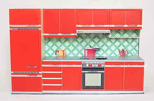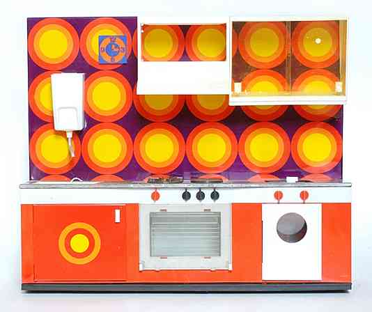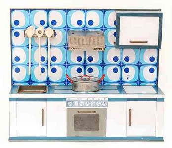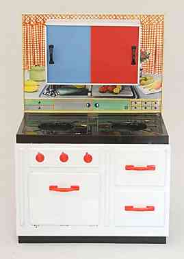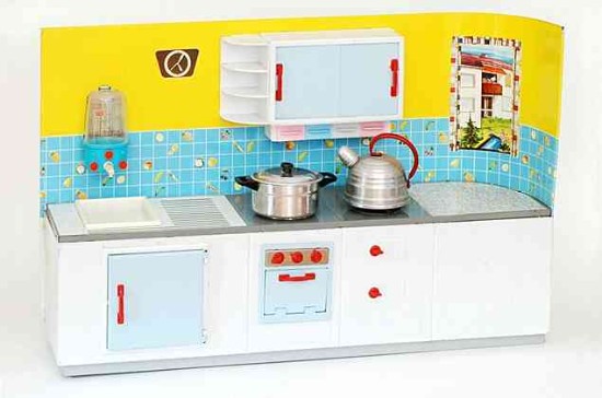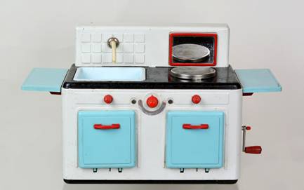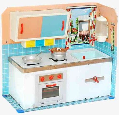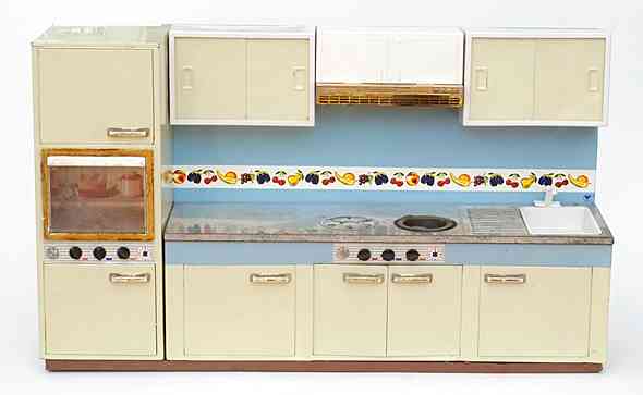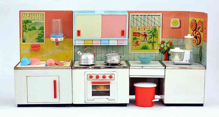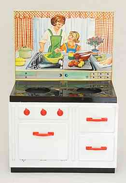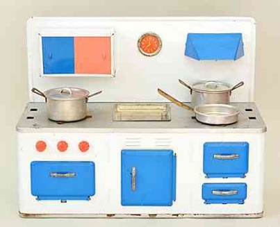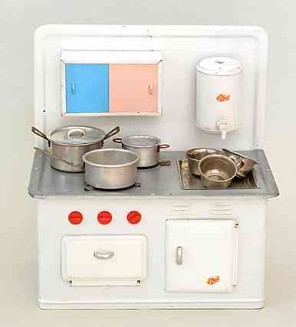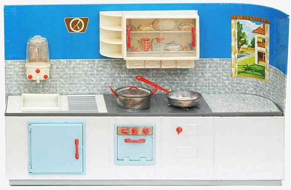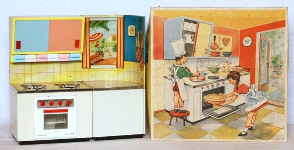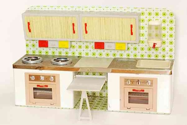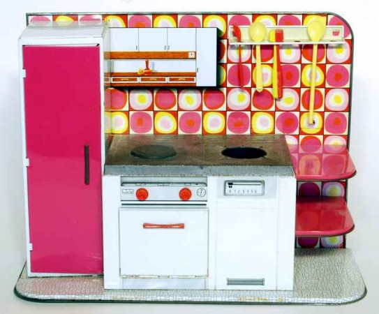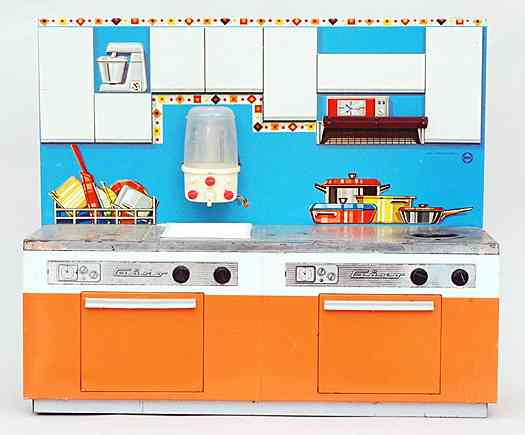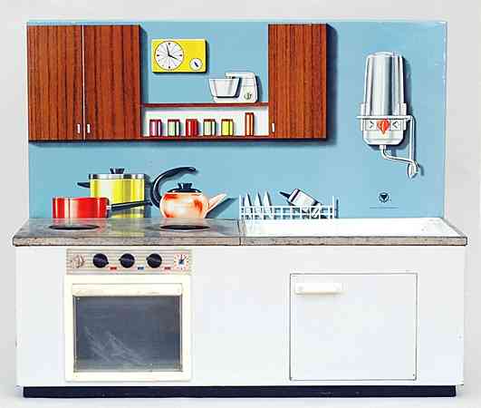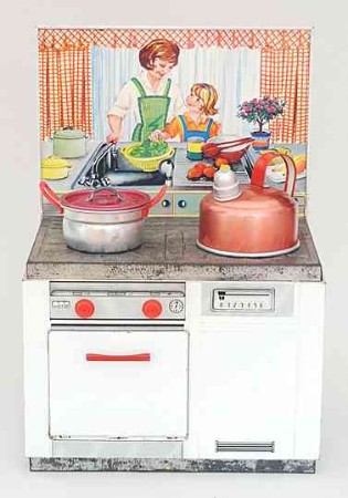 Wesentlich aussagekräftiger in Bezug auf die jeweilige Zeit ihrer Herstellung sind dagegen die mit Brennstoff beheizten Herde, welche in den 60er Jahren auch zunehmend in komplette Küchenzeilen integriert werden. Mit diesem oft ansprechend lithografierten, aber dennoch recht einfach herzustellenden Blechspielzeug ohne aufwendiges Innenleben können die Produzenten wesentlich schneller und kostengünstiger auf etwaige Neuheiten in den „echten“ Küchen reagieren und diese in das Miniaturformat übertragen.